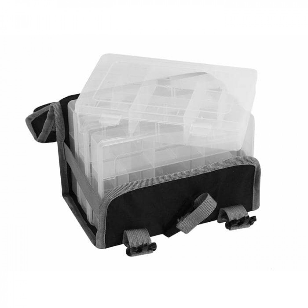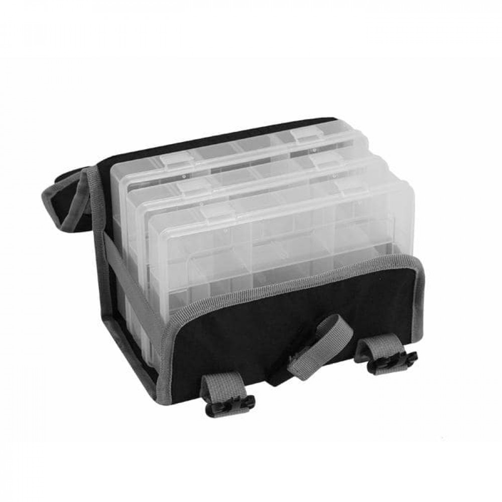 Чанта, която ще ви бъде идеален помощник във вашият спининг риболов, състояща се от 3 пластмасови кутии предназначени за различни аксесоари. Всяка една от тях има 3 разделения с размер от 12 х 4 х 4 см, с фиксирани стени, с 8 избираеми разделителни стени. Допълнителни кутии могат да бъдат закупени. Благодарение на текстилната дръжка чантата може да бъде лесно пренасяна. Отвън можете да намерите също и държач за ножици . Големите пластмасови закопчалки са предназначени и тествани за многократни отваряния и затваряния.