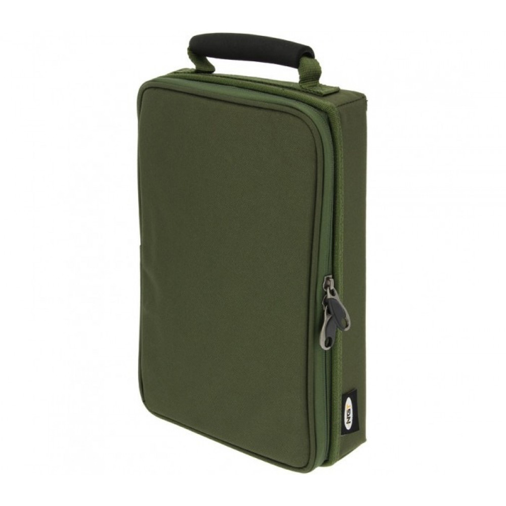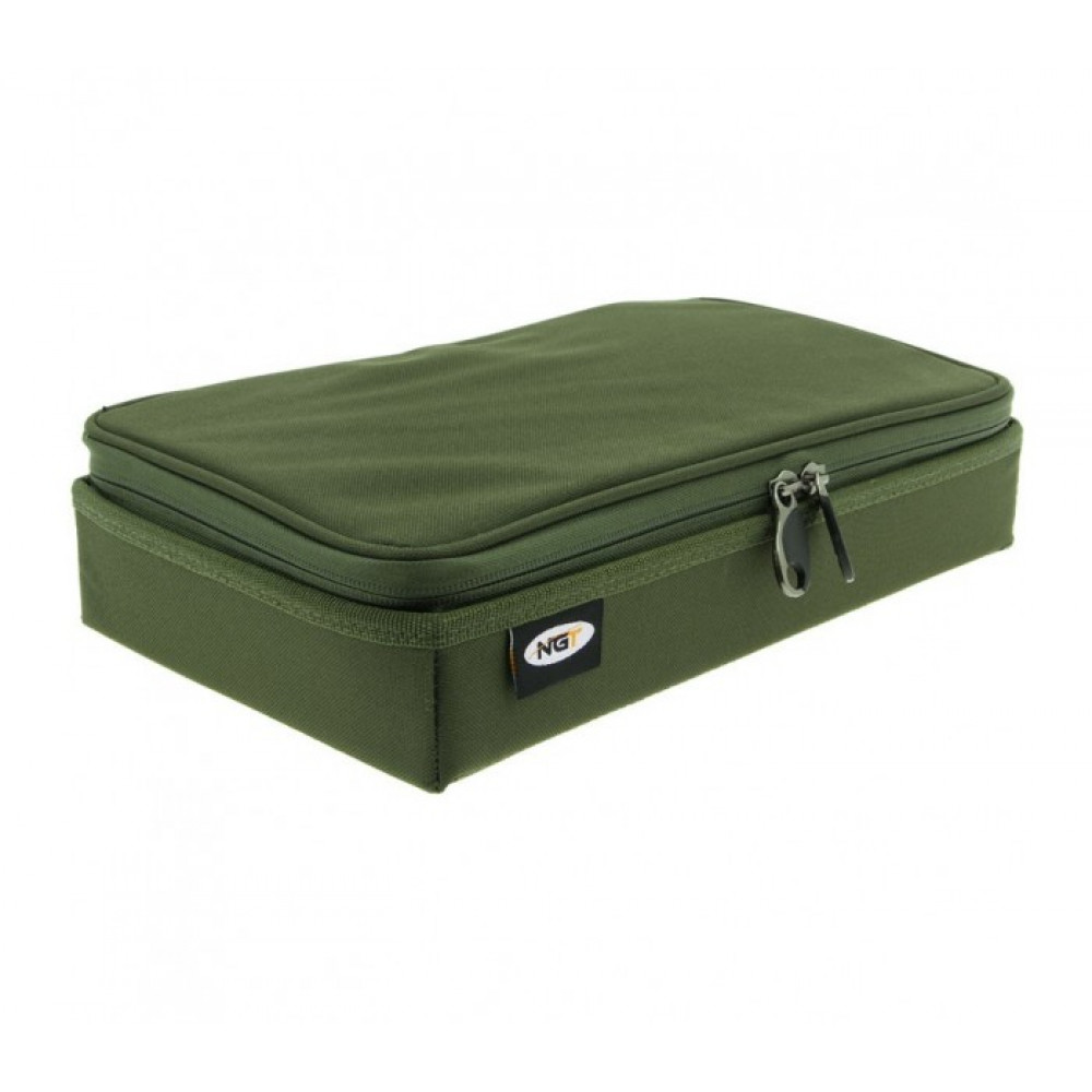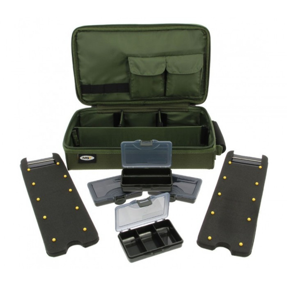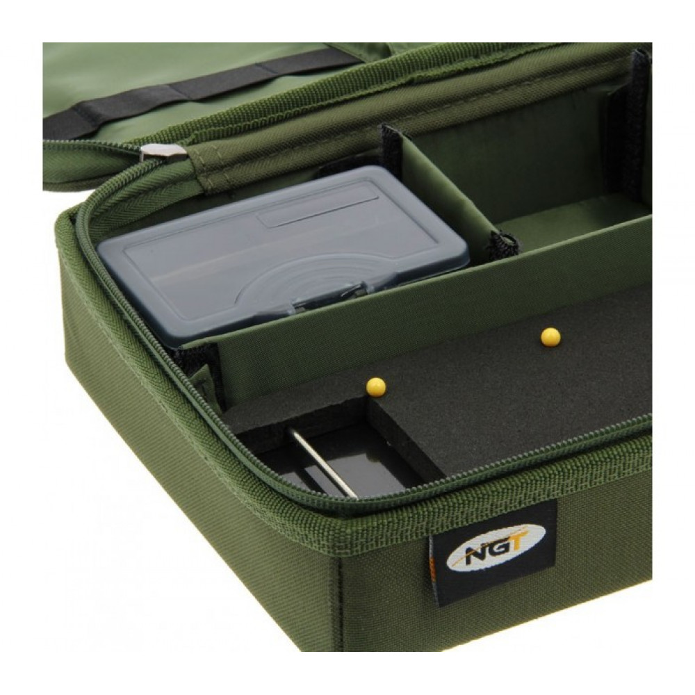 Чанта за монтажи NGT Complete Carp Rig System има четири отделения, четири малки кутийки за аксесоари и 2 бр. подвижни класьора за монтажите с включени игли. Разполага и с два отделни джоба за съхранение на допълнителни аксесоари, еластичен държач за съхранение на игли за стръв и супер мека EVA дръжка за носене.