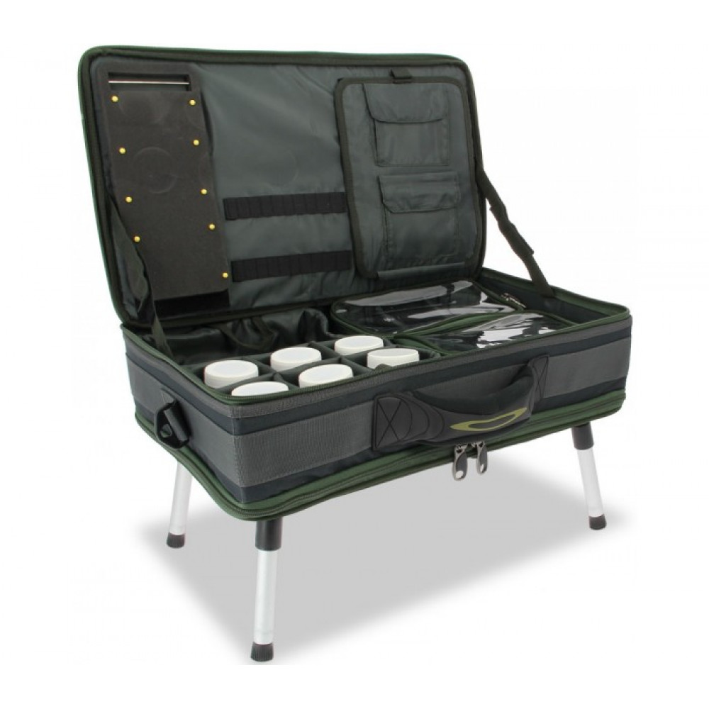 Целият комплект е закрепен към маса със сгъваеми крака. Бързо и лесно можете да отделите чантата от масата чрез цип, намиращ се по цялата ѝ обиколка.