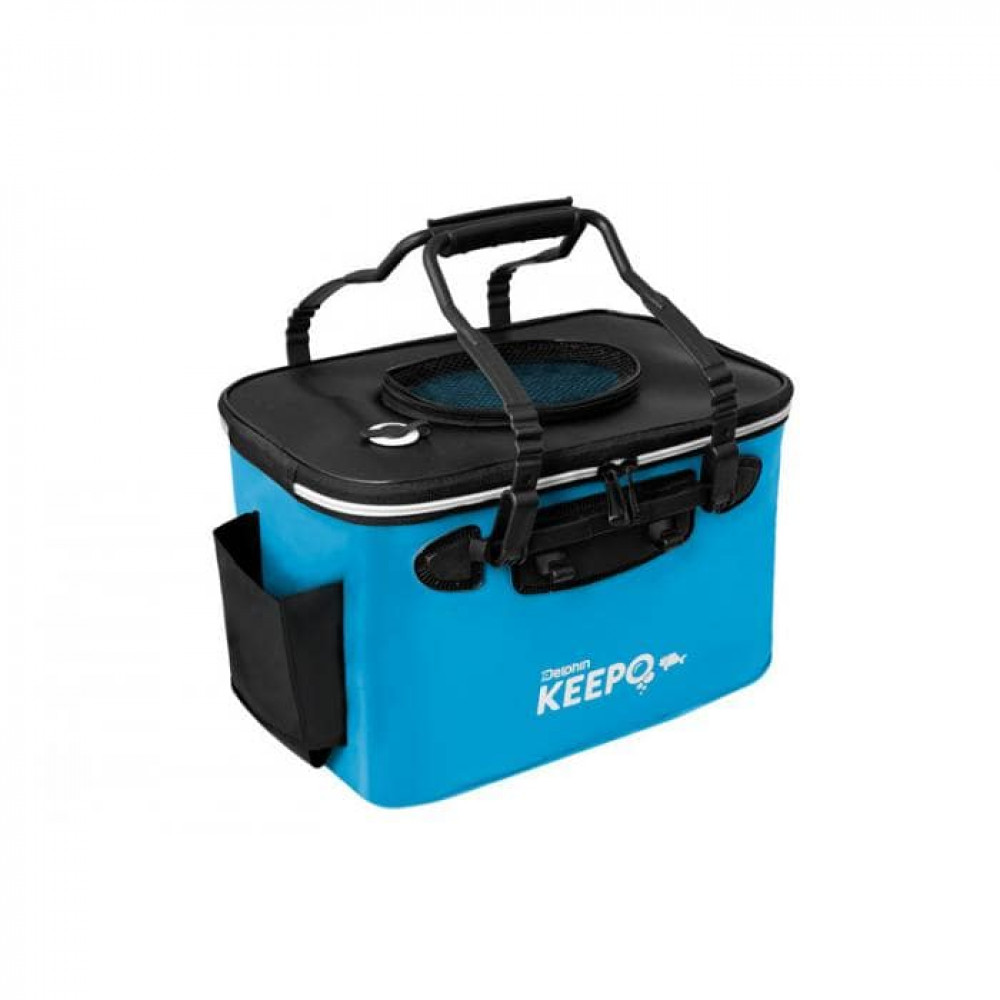 Delphin KEEPO е практична рибарска чанта, изработена от EVA пластмаса. Нейната горна част се отваря изцяло с помощта на цип. Капакът има отвор с мрежа, който ви предоставя идеален поглед на случващото се вътре. Отворът се затваря с цип по целия периметър и можете да го използвате за вадене или поставяне на жива стръв. Ще откриете и малък външен джоб, проектиран за оксигенатор (например нашите помпи за въздух Delphin A-PUMP макси или мини), както и малък отвор за тръбичката на оксигенатора. Чантата има две пластмасови дръжки, които можете да сглобите, като вмъкнете горните им части една в друга. Delphin KEEPO е практичен инструмент за всички, които желаят да ходят на риболов с жива стръв и трябва да я поддържат свежа. Чантата е проектирана да съхранява вашата жива примамка в добро състояние по време на транспорт. Освен това, можете да я използвате и като чанта, в която да съхранявате различни риболовни принадлежности.