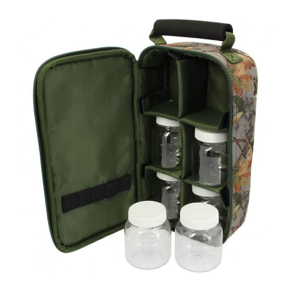 Чантичката за дипове NGT Camo Glug Pot Bag е снабдена от вътрешната страна с 3 отделни отделения, включително 6 прозрачни винтови бурканчета от PE. Зареждащата се торбичка от NGT ще издържи и надеждно ще защити съдържанието в бурканчетата. Използваните материали и качеството на изработката не оставят нищо нежелано. Оборудванa с 2-лентов цип, който осигурява прозрение на съдържанието в торбата. Тъканта на тази чанта има много висока еластичност и съпротивление при разкъсване, дори при студено време.
