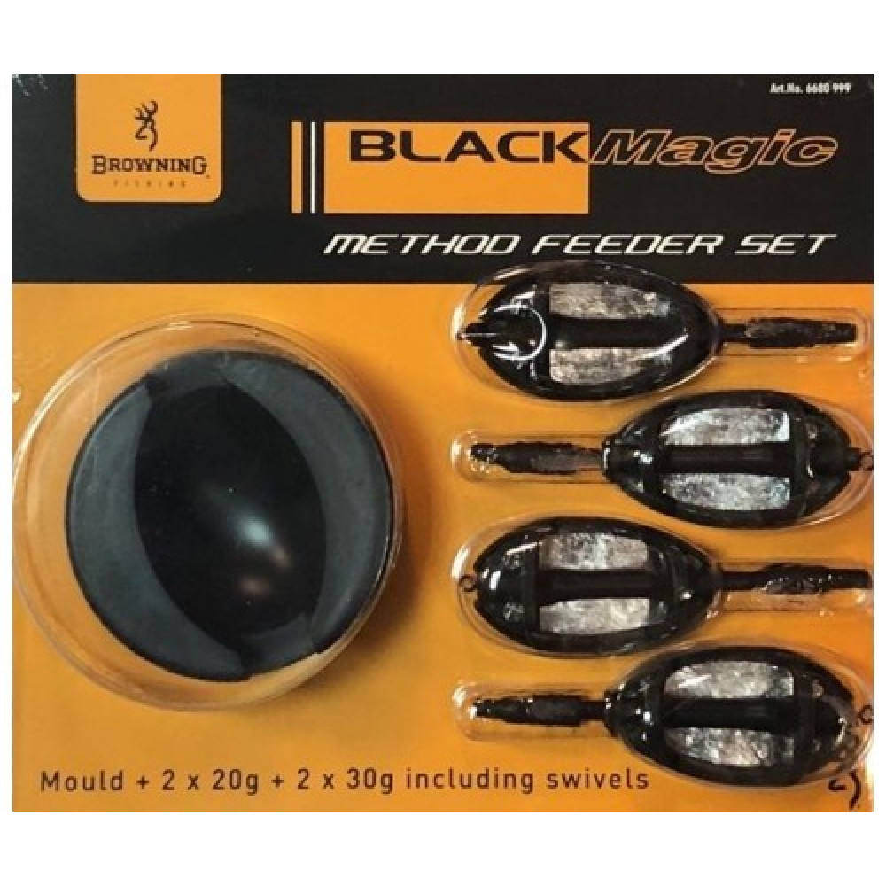 Kомплект за метод фидер на Browning Black Magic. Изработен от изключително здрава пластмаса. Включва 4 броя кошнички - хранилки и 1 бр. преса.