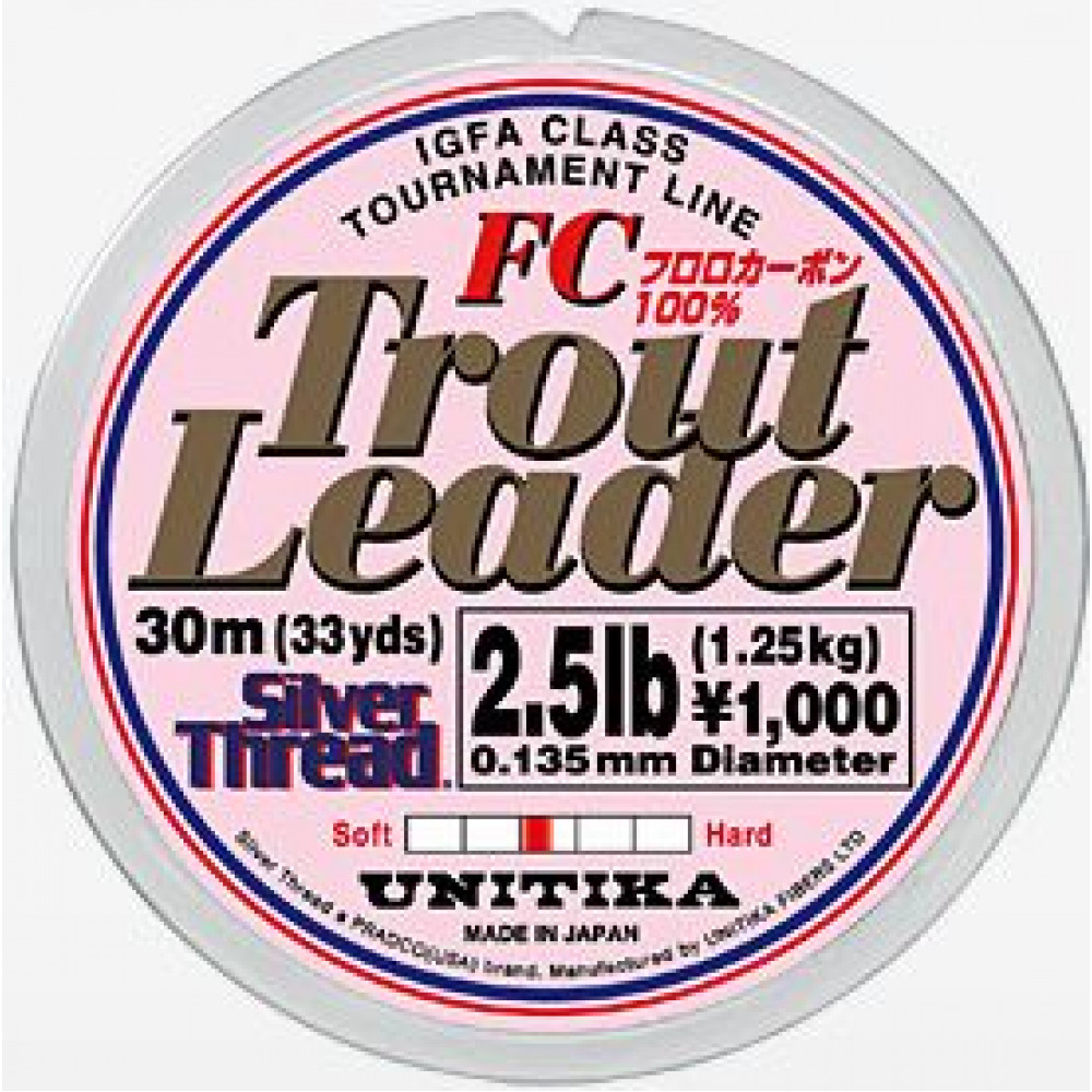 Unitika Silver Thread Trout Leader е много здраво флуорокарбоново влакно за поводи. Неговите плаващи свойства позволяват по-добро представяне и работа с повърхностни примамки както в сладки, така и в солни води. Това влакно е също толкова впечатляващо, че се използва направо като влакно за намотаване на макара. Одобрено от IGFA.