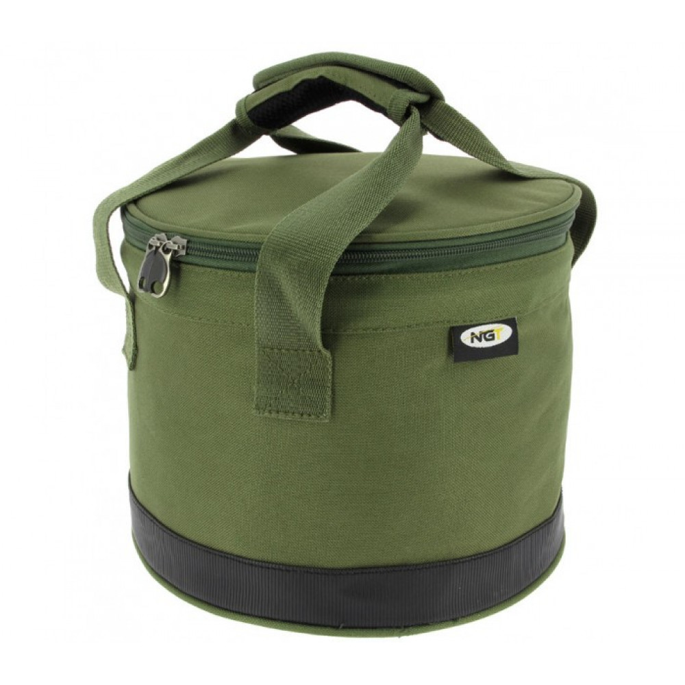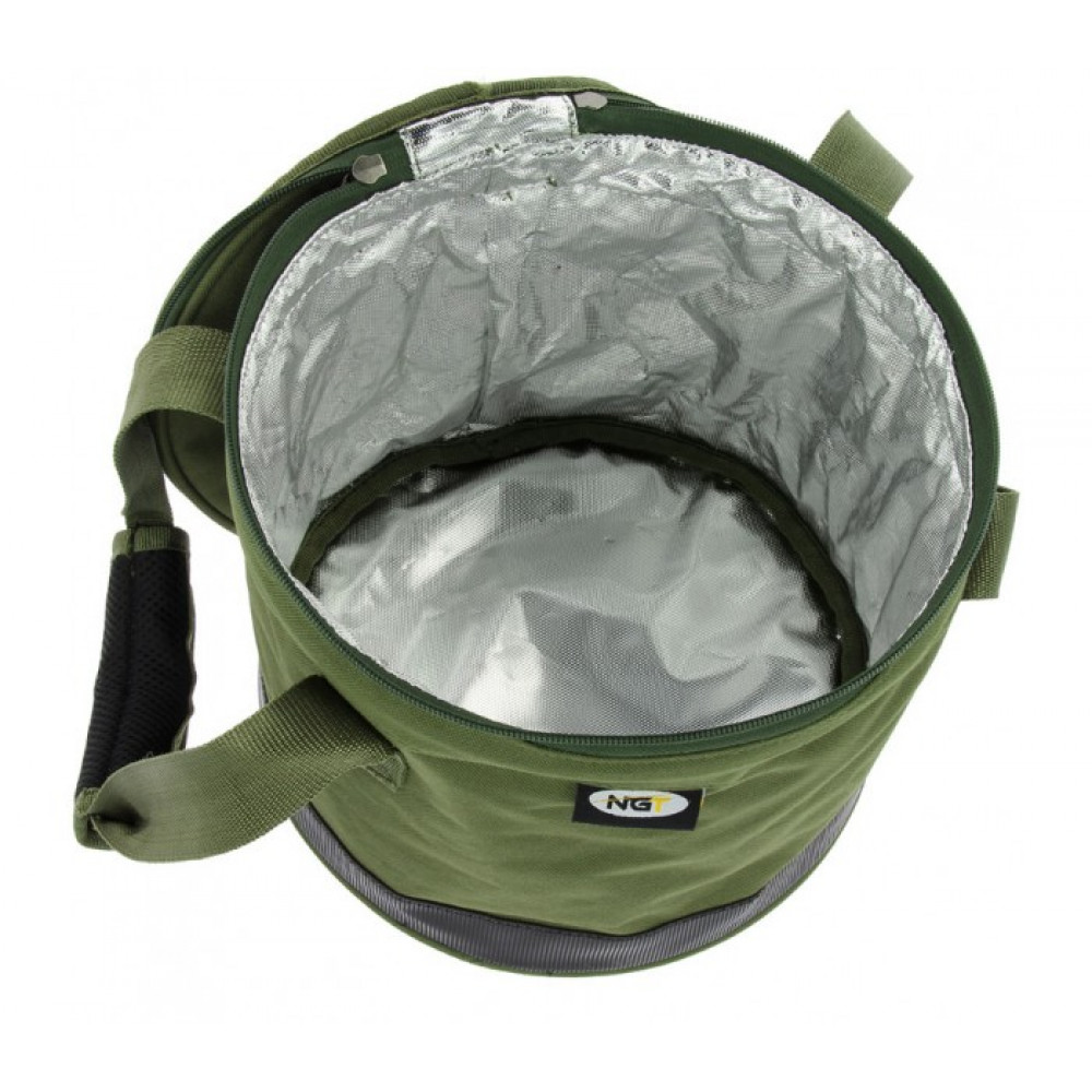 Чанта за стръв NGT Bait Bin Bag with Handles - 325 е луксозен контейнер за примамки, които е идеален за смесване и съхраняване на частици, топчета и пелети. Кофата за примамки е изработена от полиестер с висока плътност 840D с PVC подложка. Лесно се мие и почиства и в сгънато състояние заема много малко място. Окомплектован с капак, който се затваря с надежден цип и удобни и здрави за носене дръжки. Термо изолация , която предпазва вашата стръв и захранка.