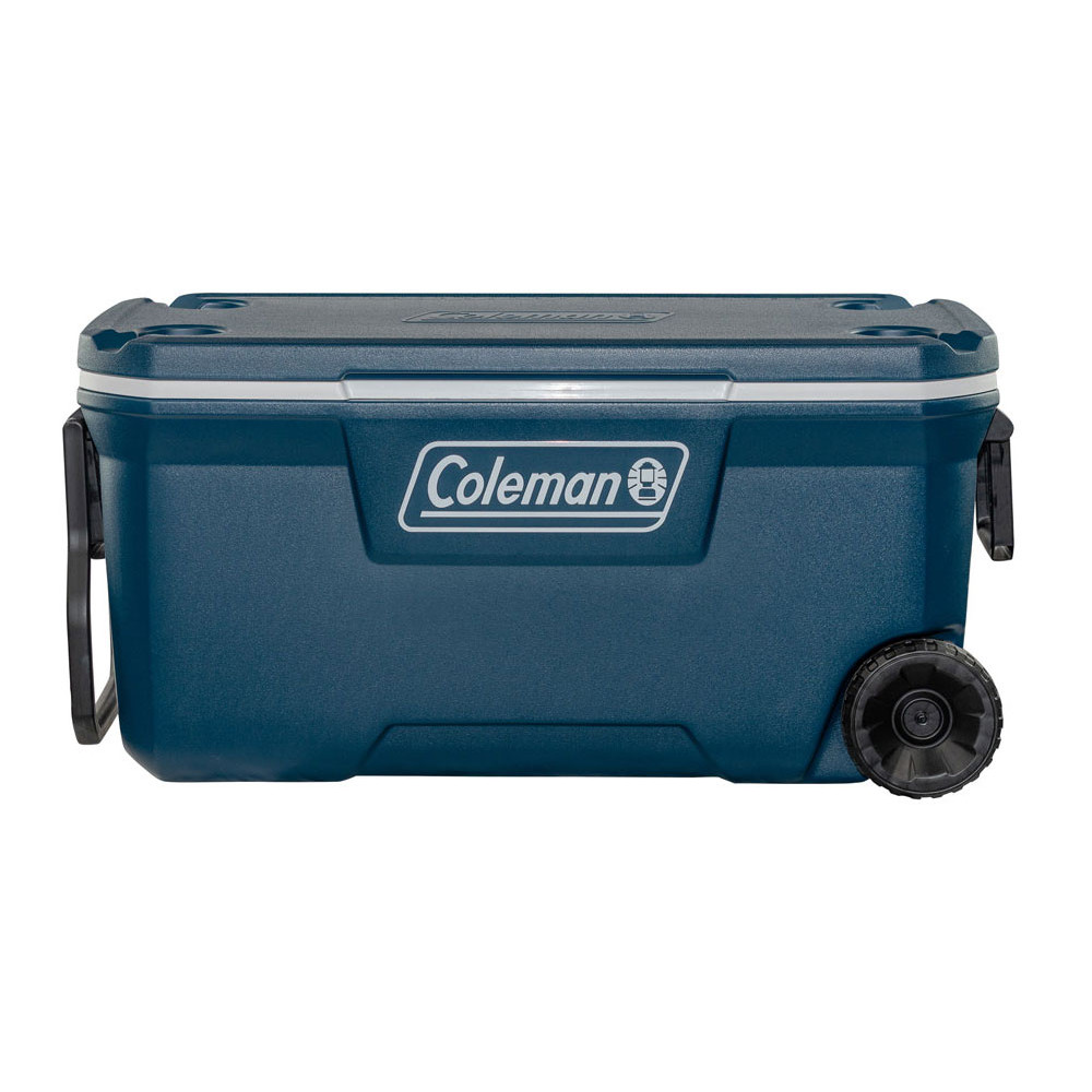 Coleman Xtreme Wheeled Cooler 100QT е оборудвана с колела за лесно транспортиране на всякакви терени. 95-литрова хладилна кутия, с която може без проблем да пренасяте големи обеми хранителни продукти и напитки, както и да ги поддържате хладни до пет дни. Моделът е изработен от термично ефективна полиуретанова пяна, като тънките стени на хладилната кутия осигуряват максимална изолация с повече място за съхранение. Хладилна кутия, която може да съхрани повече, докато заема по-малко място в колата. Повдигането на кутията е улеснено благодарение на две удобни дръжки от двете страни, а при преместване е нужно само да използвате единична голяма в единия край и да плъзгате кутията с колелата. Дръжките се прибират към кутията и не заемат място при транспортиране. Лесният за почистване изолиран капак е достатъчно здрав, за да се използва като седалка носеща до 113 кг товар, а също така разполага и с четири удобни вградени поставки за чаши за напитки. Когато е празна, всяка течност може да се източи без накланяне на кутията, а чрез устойчив на ръжда канален дренаж.