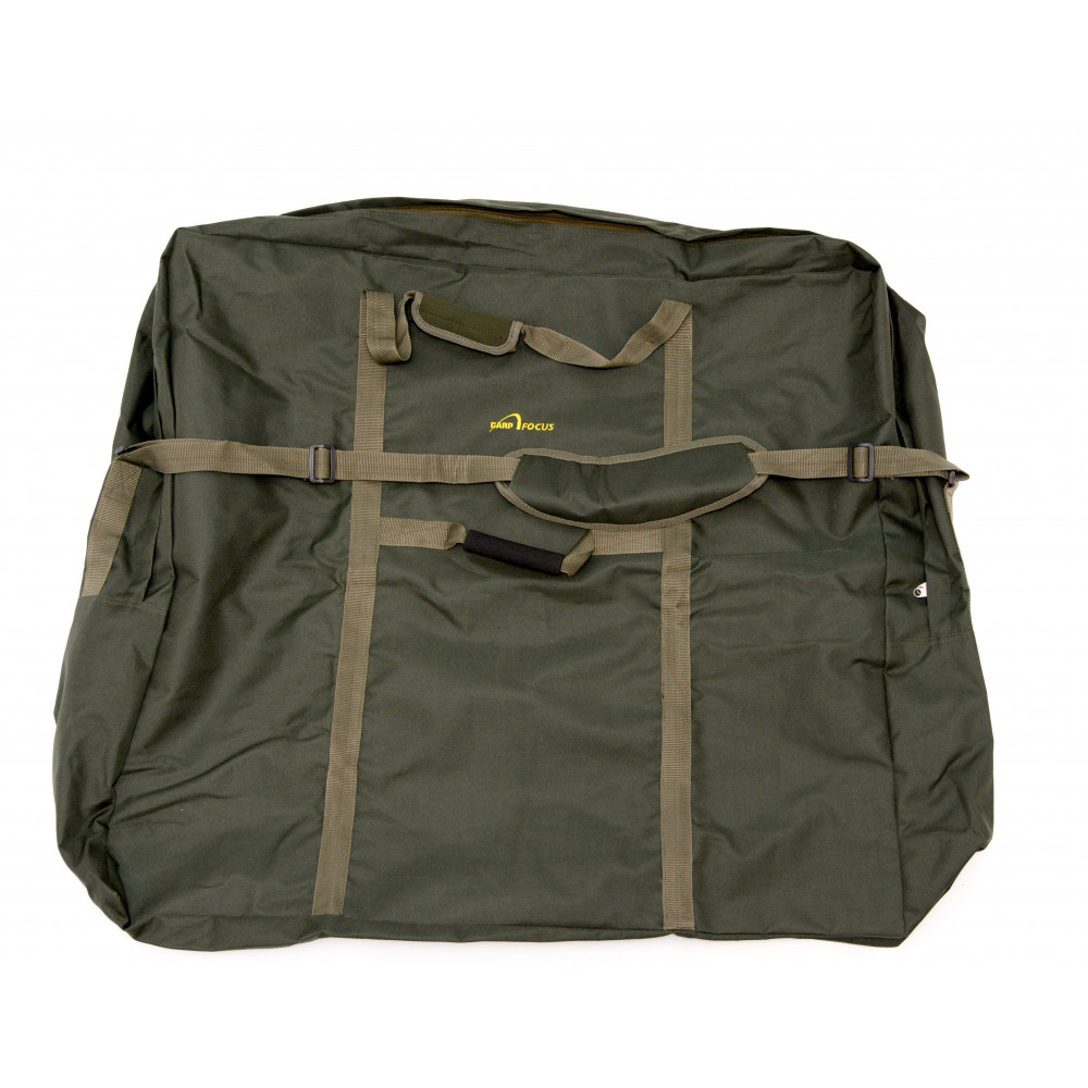 Калъф за шаранджийско легло CarpFocus. Изработен е от 420D полиестер, с гумиран вътрешен слой, което го прави непромокаем. Притежава 3 различни дръжки (къси за ръка, дълга презрамка и централна предна) прикрепени в различни точки на калъфа улесняващи риболовеца при пренасянето на леглото.