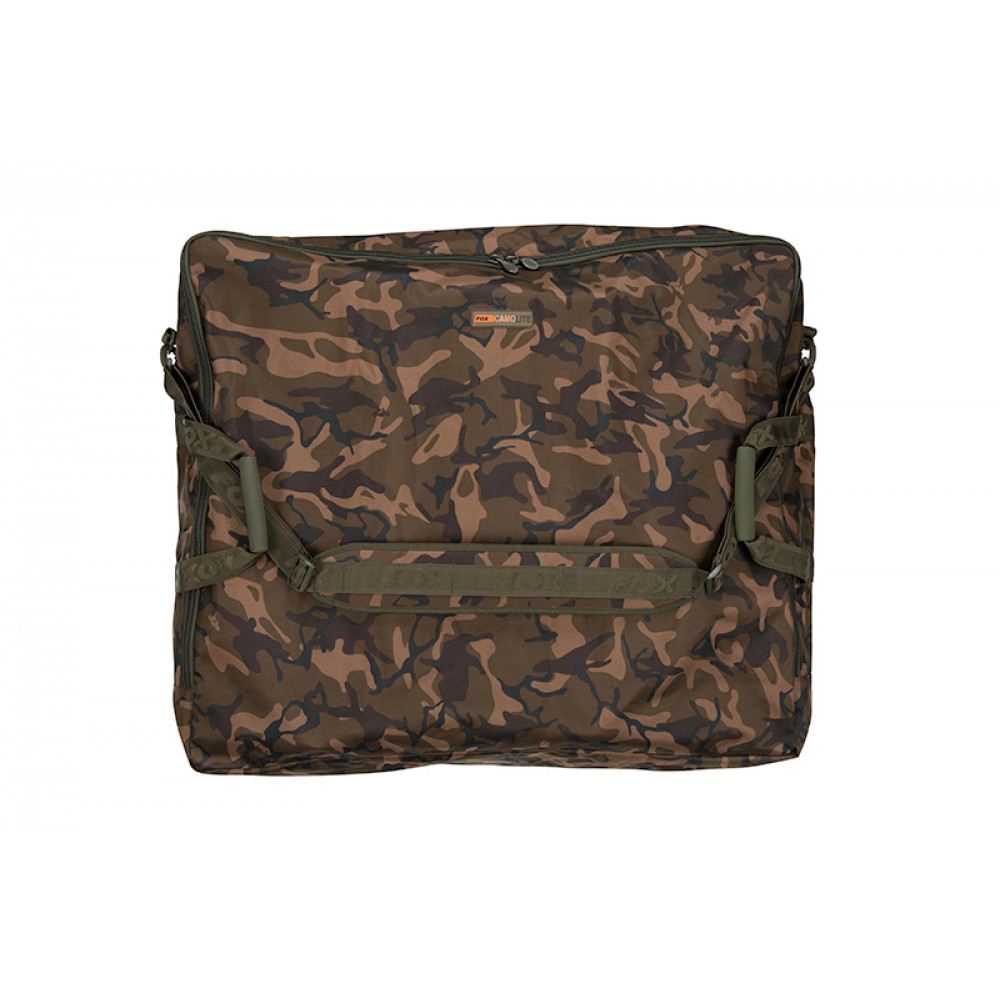 Висококачествен и практичен калъф-чанта за съхранение и транспортиране на риболовен стол от FOX, който е подходяща за столове от серията FOX Super Delux Recliner, серия R3 и други по-големи столове. Отличава се с популярния FOX Camo дизайн, двойни здрави ципове, подплатена подвижна презрамка и дръжки подсилени с EVA. Моделът е изработен от 100% обработен 500 denier полиестер с разпределение - външен слой 100 % полиестер, подплата/пълнеж 100 % полиетилен, подплата 100 % полиестер.