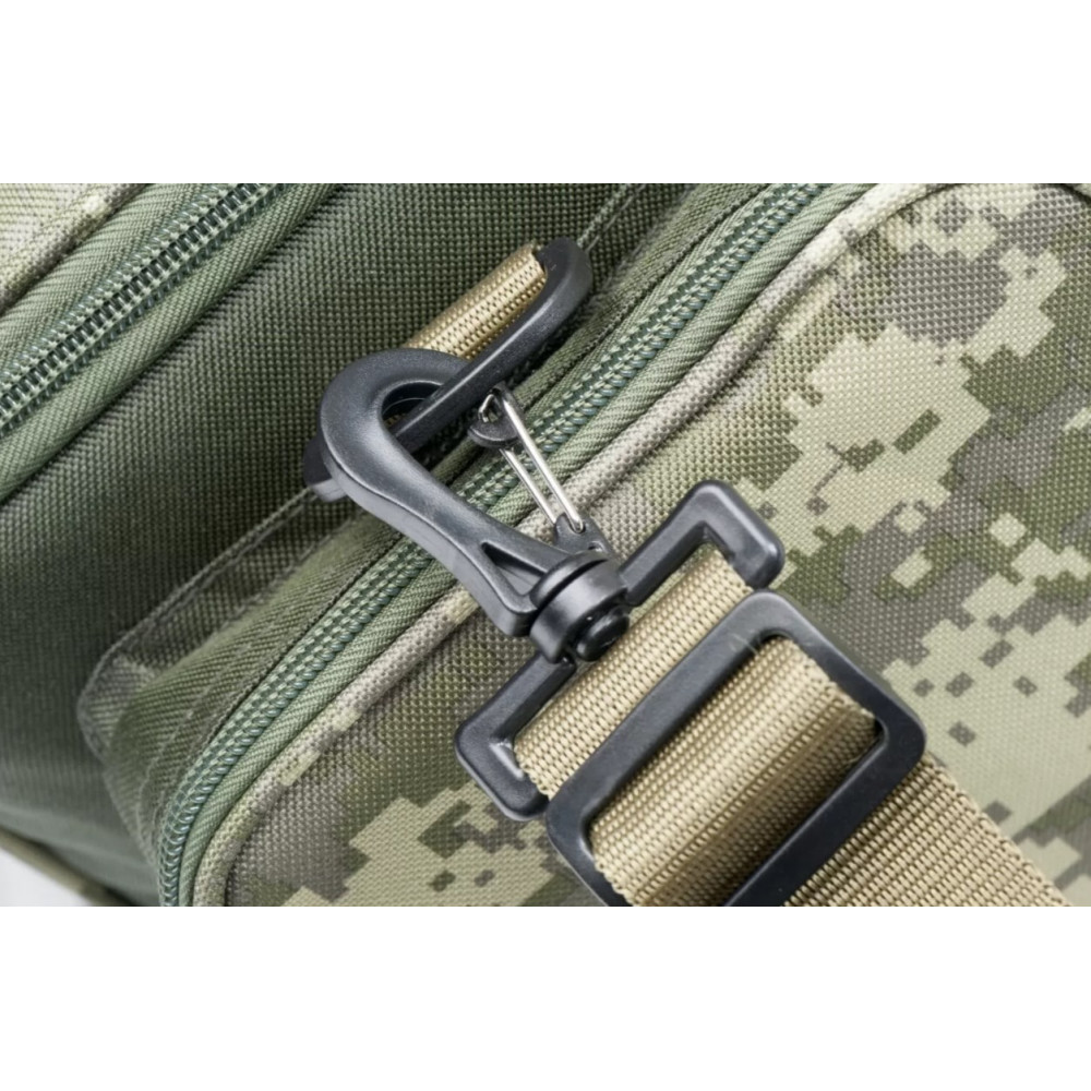 Много просторна термо чанта със странични джобове за аксесоари и голям преден джоб. Предлага се с пълния комплект аксесоари за хранене за двама души. Включва две издръжливи чинии, пълни прибори, кутии за захар и сол с прецизни силиконови уплътнения, дъска за рязане, назъбен нож, две термо чаши, отварачка за бира/вино и две малки хавлиени кърпи. Чантата е изработена с атрактивния дизайн на серията CamoCODE.