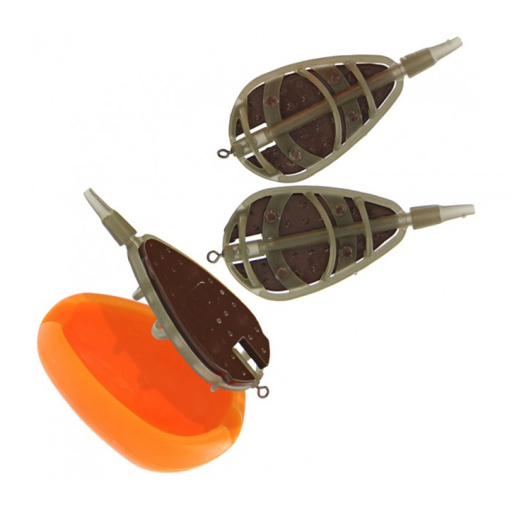 Комплект за метод фидер риболов, който включва 3бр. инлайн хранилки и преса за зареждане. Хранилките са изработени от качествен полимер с вграден вирбел.Пресата за зареждане на хранилките е лека и здрава с лесно отделяне на хранилката. Използването и води до по-далечно и точно замятане заради постоянните размери и тегло на заредената хранилка.Поводът със стръвта може да се постави както извън формата, така и в нея в зависимост от конкретните условия.Качествено изпълнение, подходящо за големи дистанции в реки и язовири.