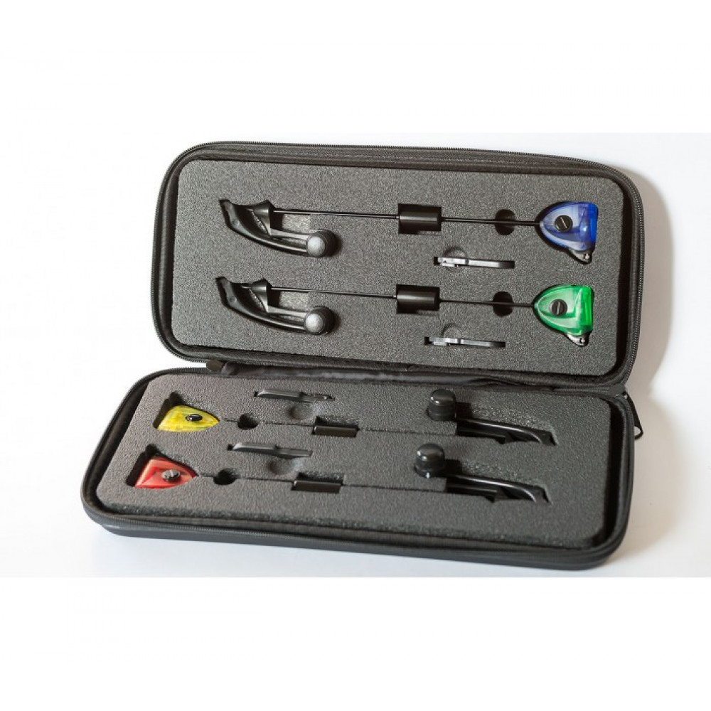 Комплект светещи обтегачи CarpMax Swingers - 3бр - Великолепен комплект от три светещи обтегача за шаранджийски риболов. Обтегачите се предлагат в различни цветове. Оборудвани са с балансираща подвижна тежест за регулиране на напрежението върху линията. Рамото на обтегачите е снабдено с пружина с две степени на натегнатост. Всеки суингер е с диод, светещ в определен цвят – лилав или жълт, червен и зелен. Дължина на обтегачите – 28 см. Клипсът за прикрепяне към линията е с много фина изработка. Конструкцията на клипса позволява безпроблемно откачане на обтегача при засичане. Този модел обтегачи са снабдени с жак за включване към сигнализатор, а в допълнение е предвидена и възможност за поставяне на светеща ампула. Окомплектовани са в подходящо подплатен твърд калъф със самостоятелни отделения за всеки обтегач.