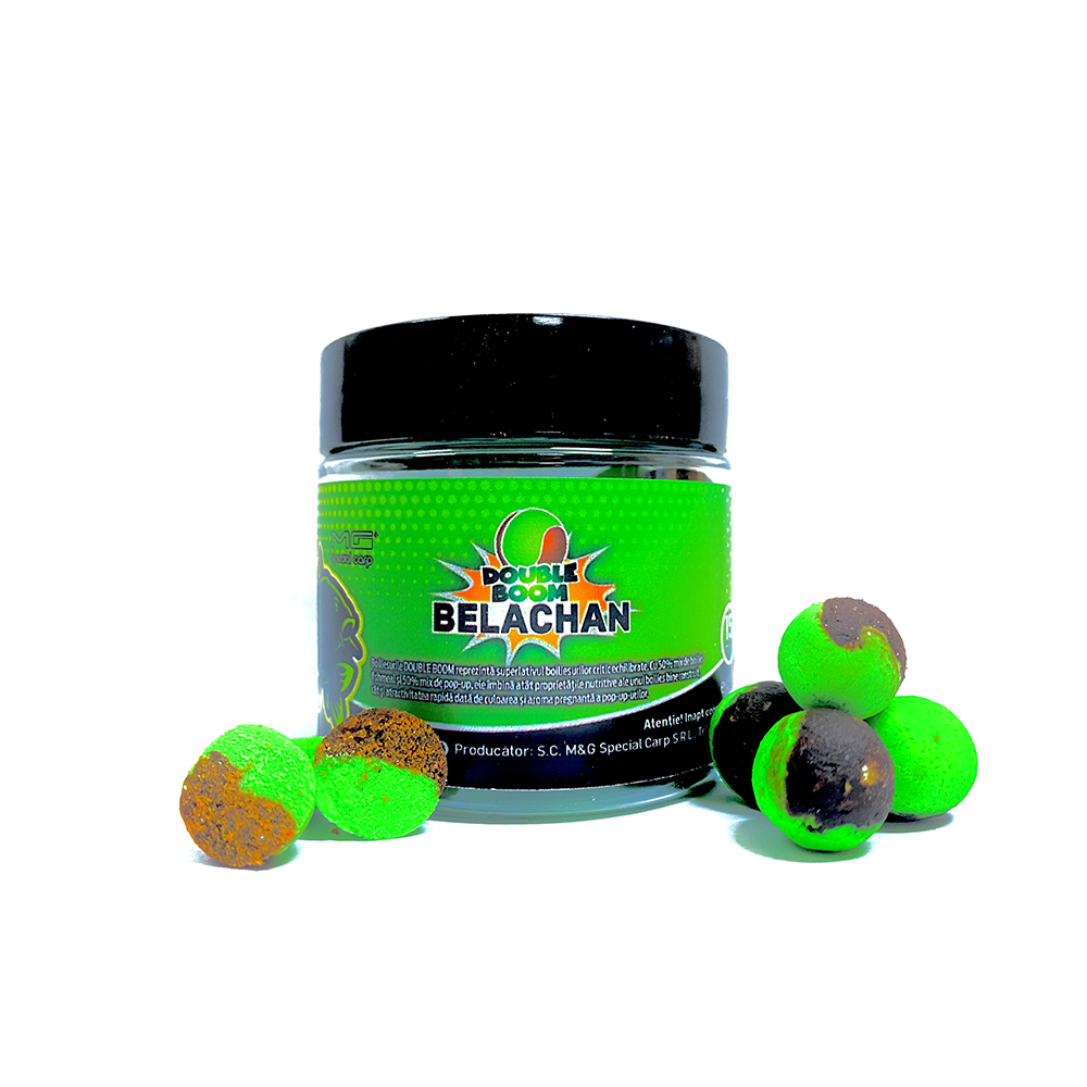 Бойлите от серията Double Boom са превъзходната сила на критично балансираните топчета. Направени от 50% микс от фишмийл бойли и 50% Pop Up, те съчетават както хранителните свойства на протеиновите топчета, така и бързата привлекателност, придадена от силния цвят и аромат на попъпите.