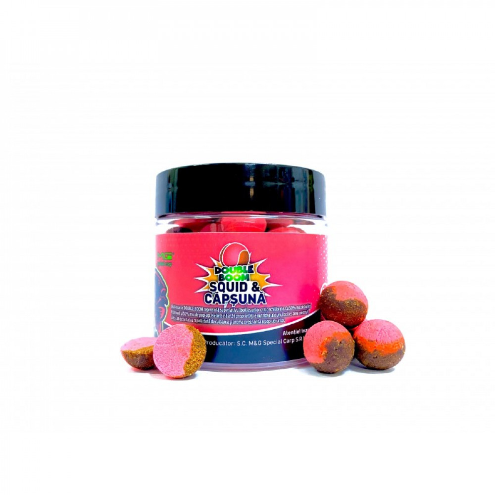 Серията топчета Double Boom 50/50 представляват 50% протеиново топчета и 50% поп-ъп топче. Имат силен аромат и изкрящ цвят. Повишената плаваемост и гаранцията за убождане на рибата по много по-правилен начин, правят боилите една от най-желаните примамки за шаран.