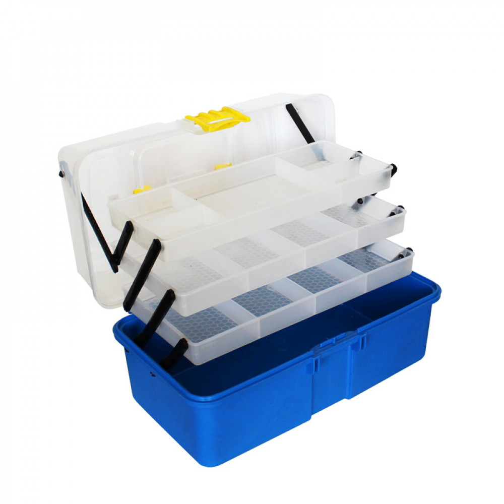 Удобен куфар за съхранение на аксесоари и принадлежности за риболов. Моделът има едно голямо отделение и три нива с различно разпределени прегради за сортиране на аксесоари с различни размери (преградите не са подвижни). Цветът на продукта може да варира.