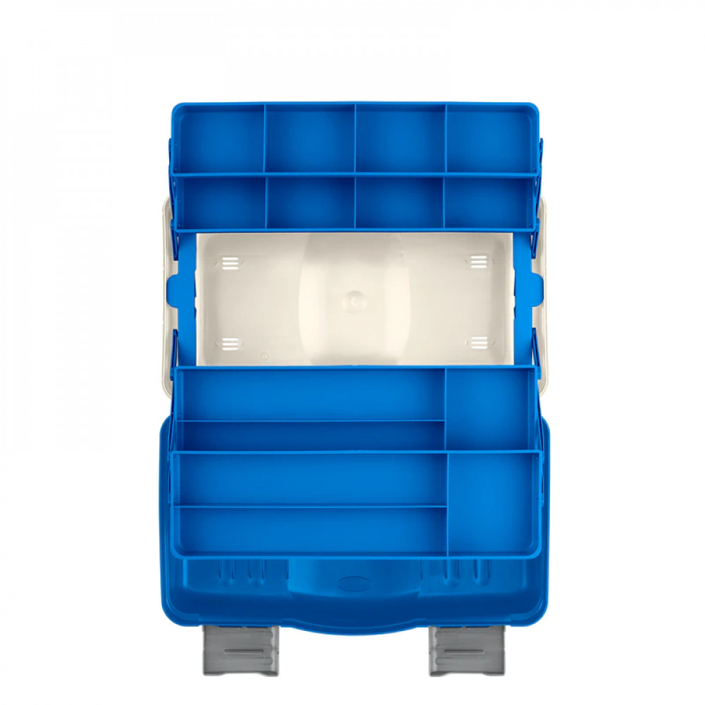 Полипропиленов куфар с двустранна двуетажна система и 14 отделения за съхранение на принадлежности. Ергономична дръжка.
