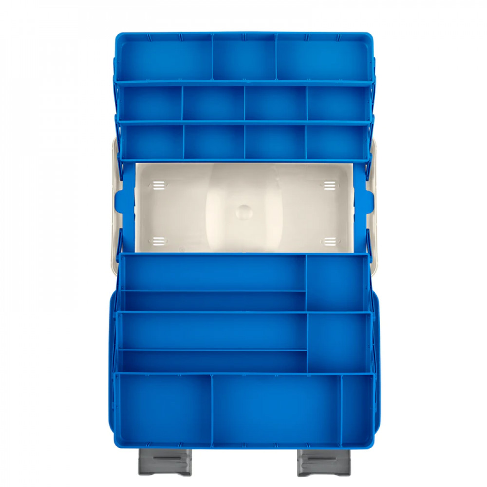 Полипропиленов куфар с двустранна двуетажна система и 22 отделения за съхранение на принадлежности. Ергономична дръжка.