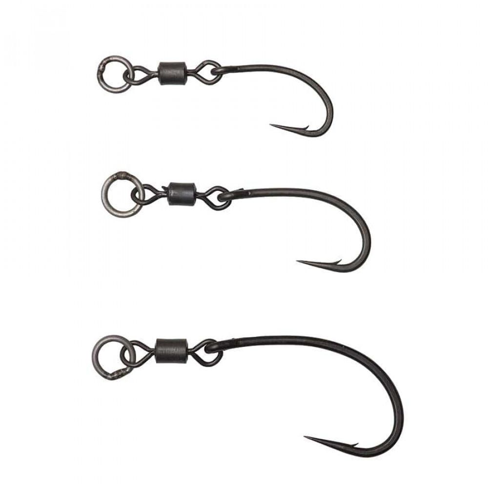 Перфектен за плуващи презентации в стил Spinner / Ronnie Rig или за легнал монтаж при твърди презентации на дъното. Доставя се с термо свиваем шлаух, който се плъзга по стеблото на куката, за да създаде агресивен ъгъл, подобен на нокът, за моментално завъртане на куката. Движението на 360 ° куката позволява примамката да се завърти във всяка посока, което води до същото опустошително ефективно задържане. Доставя се готово, снабдено с пръстенообразно въртящо се движение през окото на куката, осигуряващо много по-спретнато, опростено представяне, отколкото обикновеното бързо сменяемо завъртане предлага. Просто завържете вирбела с големия пръстен, като използвате избрания материал за кука, прикрепете стръвта и сте готови да започнете да ловите риба!