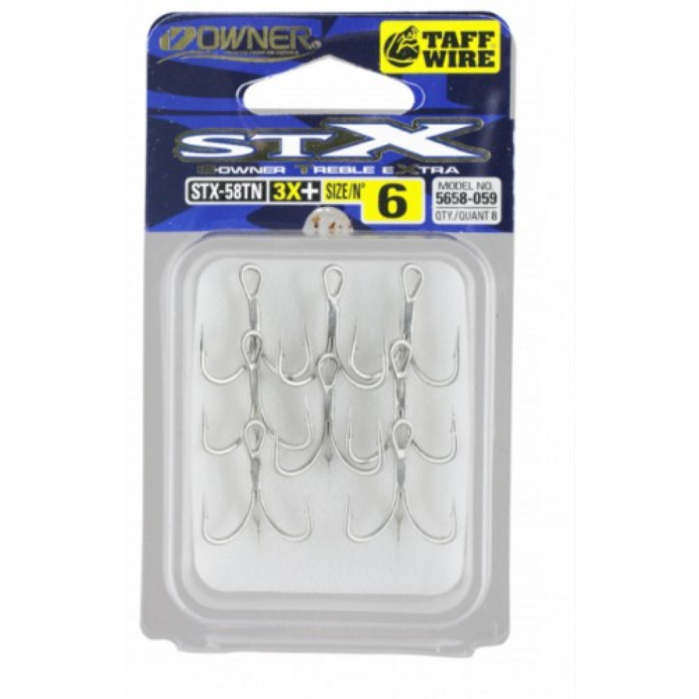 Произведени са от нов тип тел, чиято ядро е с 20% по-силно от материалите използвани в другите модели тройки от Owner. TAFF-WIRE™ спомага за създаването на куки с малък диаметър, но същевременно по-силни и устойчиви от всякога, защото основната важна характеристика за пробивна способност е диаметъра на куката. Стандартна дължина на рамото, остриета със Super Needle Points върхове и антикорозионно покритие за защита от солена вода.