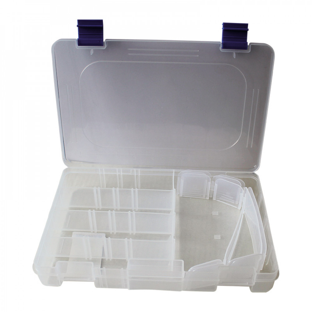 Прозрачна кутия с 5 фиксирани отделения, като 4 са еднакви, а 1 е по-голямо. Притежава 13 подвижни прегради и линийка върху капака в инчове.