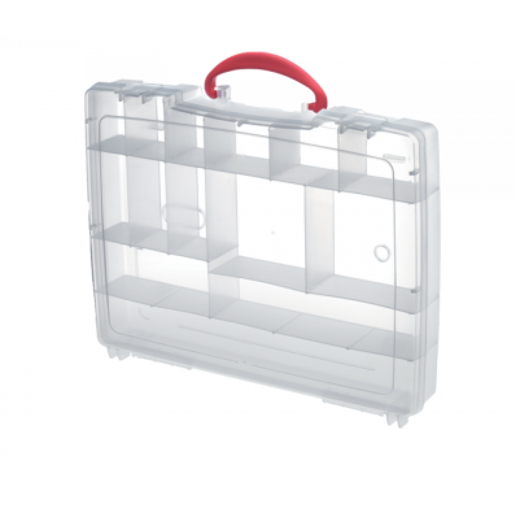 Прозрачна полипропиленова кутия за аксесоари с дръжка. Разполага с 14 отделения.