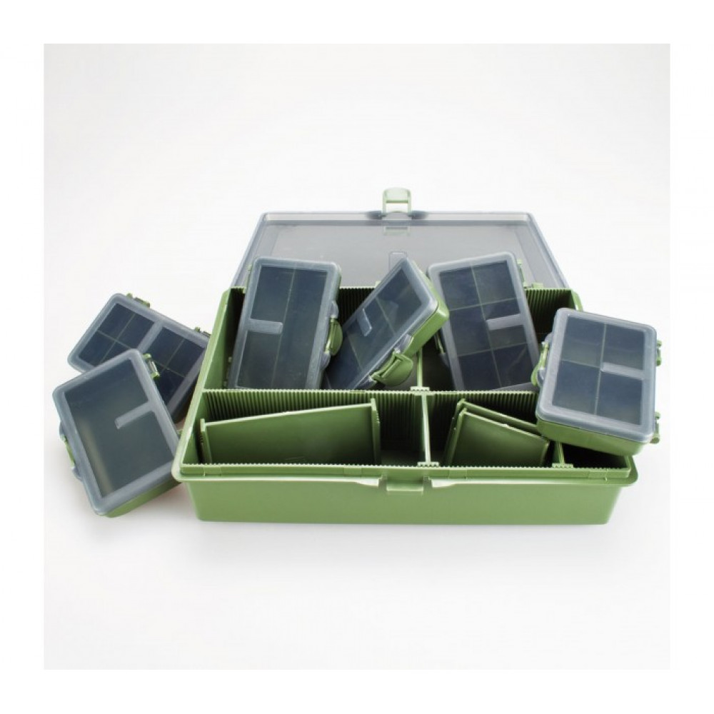 Кутия за аксесоари Carpmax Medium - неизбежен аксесоар за всеки шаранджия. Комплектът включва една голяма кутия с шест малки вътре в нея, разделени посредством местещи се прегради. Кутията се затваря плътно, така че да не влиза вода и прах.