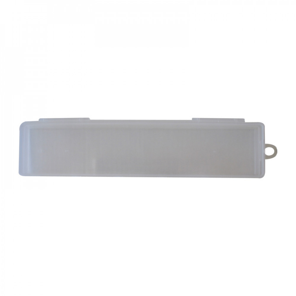 Дълга прозрачна кутия, подходяща за съхранение на плувки.