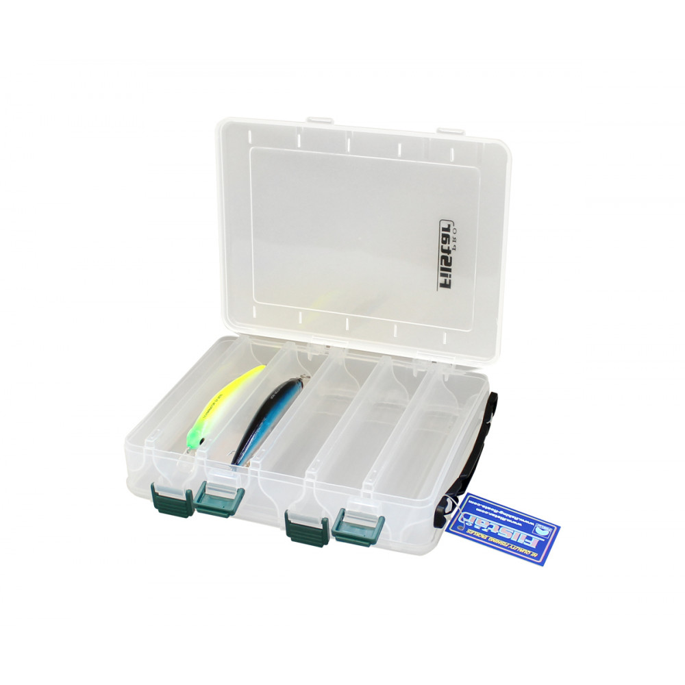 Двустранна кутия за воблери с 14 отделения и здрави закопчалки.