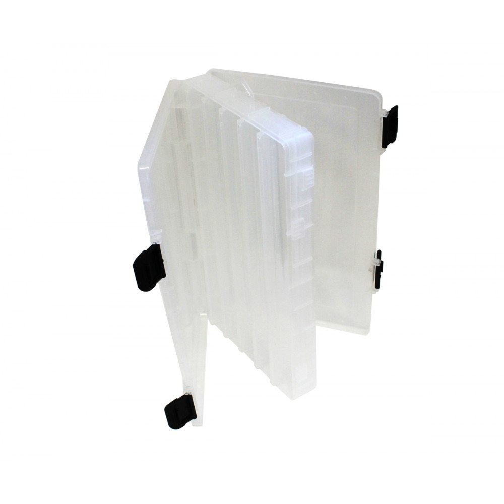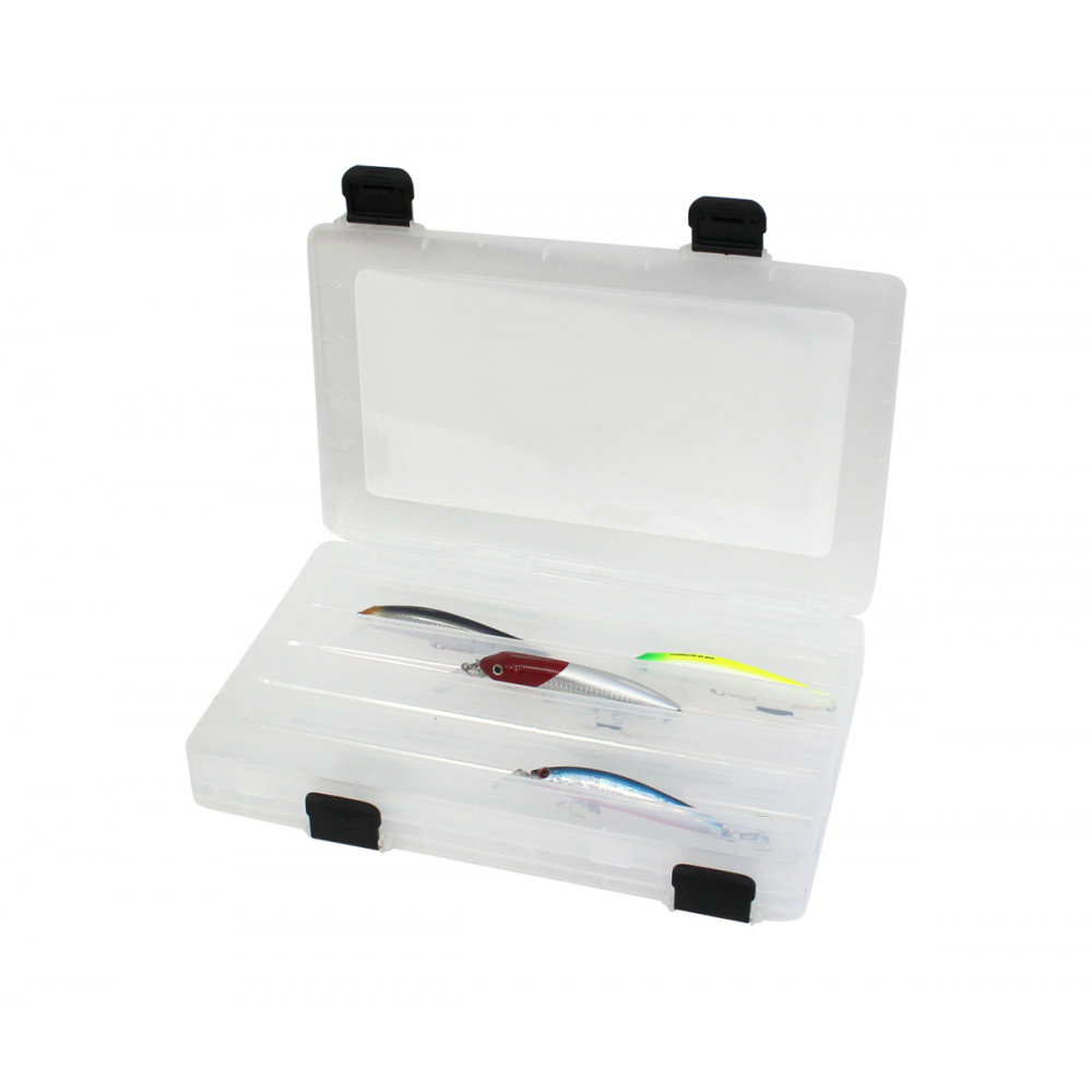 Голяма двойна кутия за воблери, разполагаща с по 5 надлъжни отделения, разположени от двете и страни. Оборудвана е с капаци, които се закопчават сигурно с клик закопчалки. Всяко отделение е с дължина 34.5 см и предлага достатъчно място за съхранение на вашите воблери, които може да идентифицирате лесно през прозрачните капаци. Моделът е с размери, същите като на популярната вече кутия за воблери SF379 XL.