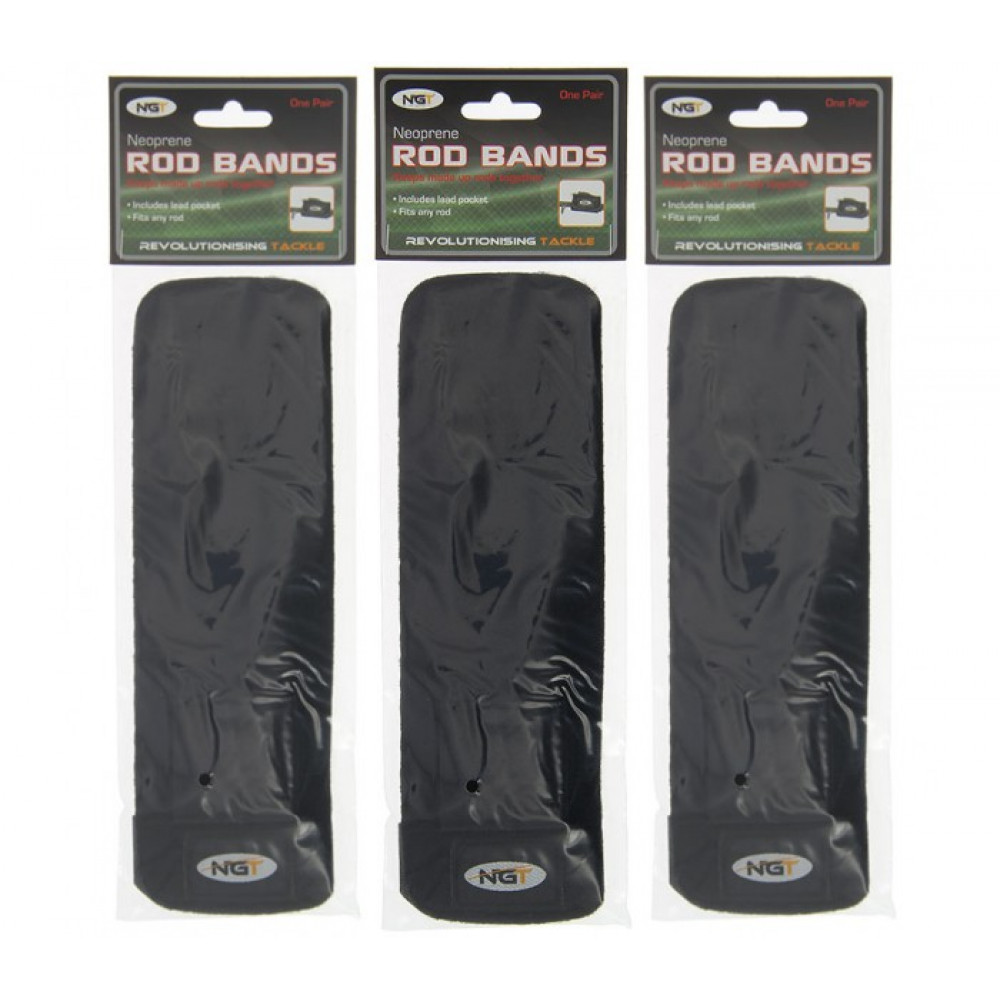 Лепки за въдици NGT 2 pc Rod Bands е комплект от 2 висококачествени ленти, изработени от неопрен с велкро закопчаване, проектирани да държат разглобената въдица заедно с монтажите. По-голям размер за долната част, и по-малък размер за горната част. В по-голямата лента има дупка, в която се прибира оловото на монтажа.