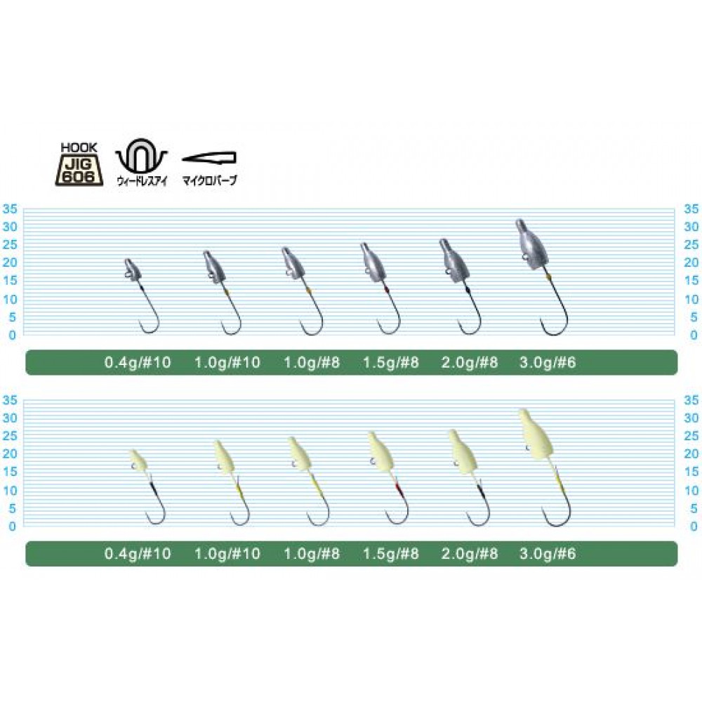 Светещи микро джиг глави, предназначени за лек морски или сладководен риболов. Светещият цвят е чудесен избор при нощен риболов. Намират приложение и при сладководен риболов на костур или пъстърва с фини техники. Формата им наподобява куршум, а ухото е уголемено с цел улеснено прокарване на влакното. В началото на куката е поставена ръчно намотана контра, за подсигурено задържане на примамката.