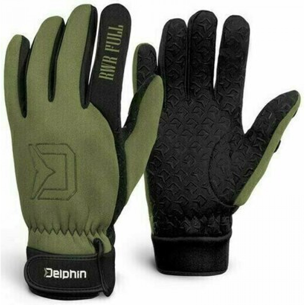Целите неопренови ръкавици Delphin RWR ще поддържат ръцете ви топли дори в най-студените дни. Детайлната изработка на ръкавиците издига зимния риболов на съвсем различно ниво. Голям плюс е абразивната повърхност на дланта, която е с противоплъзгащ, гумиран слой с иновативен дизайн на логото на Delphin. Ръкавиците не са снабдени с подвижни върхове на пръстите и следователно не прониква студ или вода през пръстите, което със сигурност ще бъде оценено от шаранджиите по-специално при по-дълги експедиции. За да предотвратите попадането на студена или нежелана вода около китката ви, уплътнението е направено от пришита гума и може да се регулира допълнително със с велкро. Цветовата комбинация от зелено и черно прави ръкавиците RWR Full перфектният спътник за риболов, както и за други развлекателни дейности на открито.