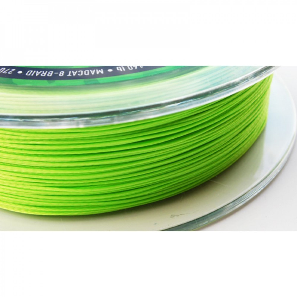MADCAT 8-BRAID е меко, здраво и кръгло 8-нишково (HMPE) влакно с ярко зелен цвят. Подходящо за спинингови макари, макари със свободна шпула, мултипликатори.