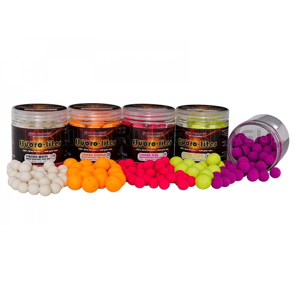 Плуващи протеинови топчета без аромат Starbaits fluoro-lites налични в 4 светли флуоресцентни цвята. Основната концепция на този продукт се крие в това, че тези плуващи топчета са без аромат и могат да бъдат ароматизирани с какъвто и да е дип. Към всяка кутия има прибавени безплатни стопери за топчета.