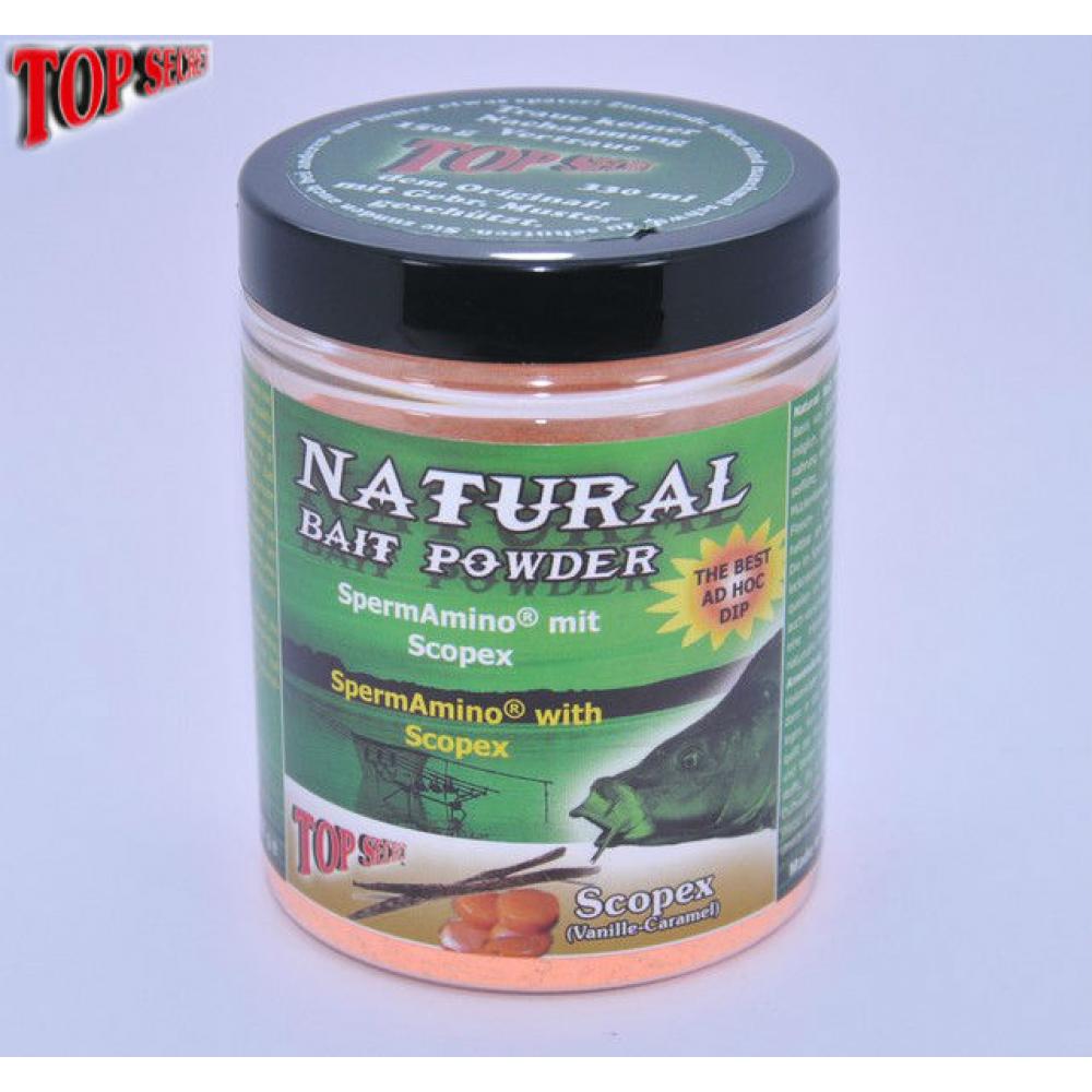 Шаранджийска пудра Top Secret Scopex - Амино пудра с аромат на ванилия и карамел-(scopex), съдържаща висококачествени екстракти от gammarus pulex, water fleas(водни бълхи), midge larvas(стволови ларви) и silkworms(копринени буби), които правят пудрата неустоима за шараните. Пудрата е с висок коефициент на разтваряне, което води до силно концентриран аромат в периметъра около вашата стръв.