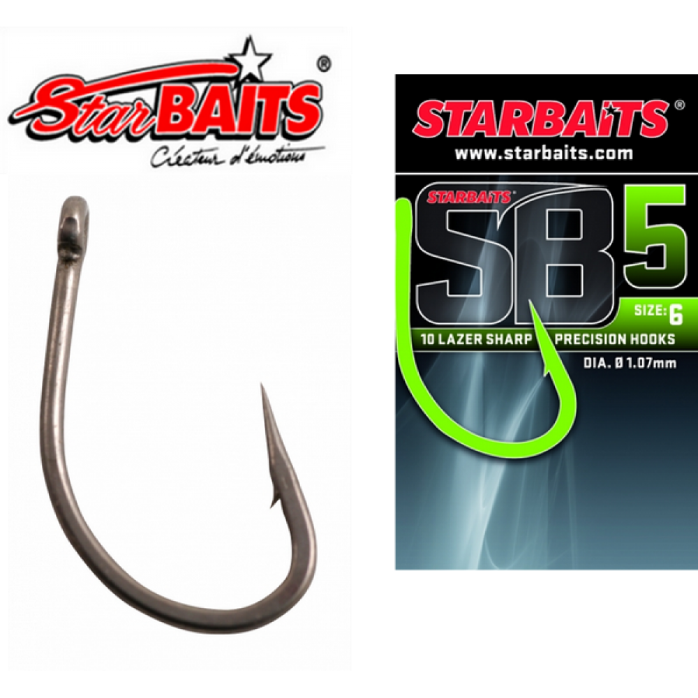 Куките на StarBaits от SB5 серия куки са изключително здрави и много остри. Изцяло ковани за допълнителна здравина, което ги прави идеален избор за силно обрасли и буренясали водоеми. Куките от серия SB5, както и всички други серии, са изработени от японска стомана, имат PTFE анти-рефлексно покритие и са лазерно заточени.
