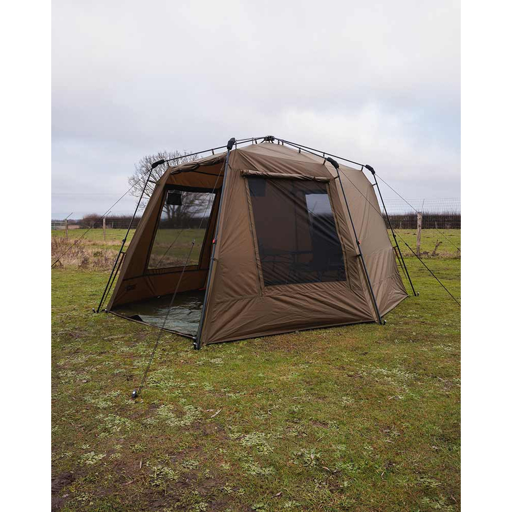 Шатра EOS Social Shelter Ви дава перфектното пространство за социални събирания по време на дълги риболовни сесии с къмпинг. Бързо разпъваща.Не е необходимо да добавяте и махате рейки при разпъване на основното помещение.
