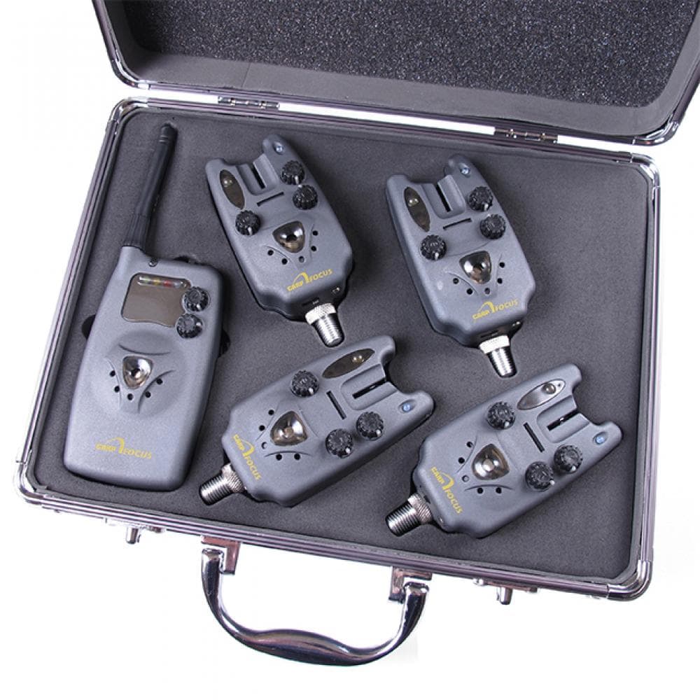 Комплекта е в метален куфар - 3 или 4 сигнализатора със станция. Обхват до 200 м, водо-устойчиви, гумирано покритие, дневен и нощен режим, жак за светещи обтегачи. Работят с батерии 9v