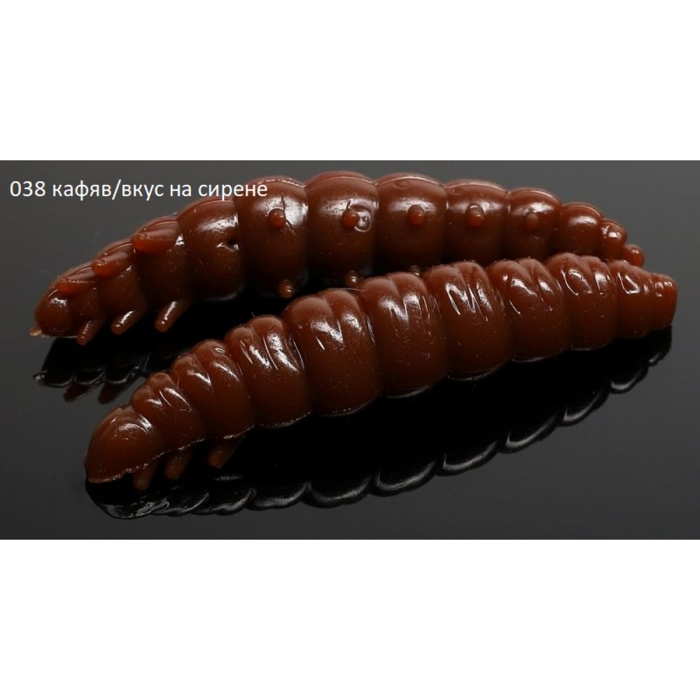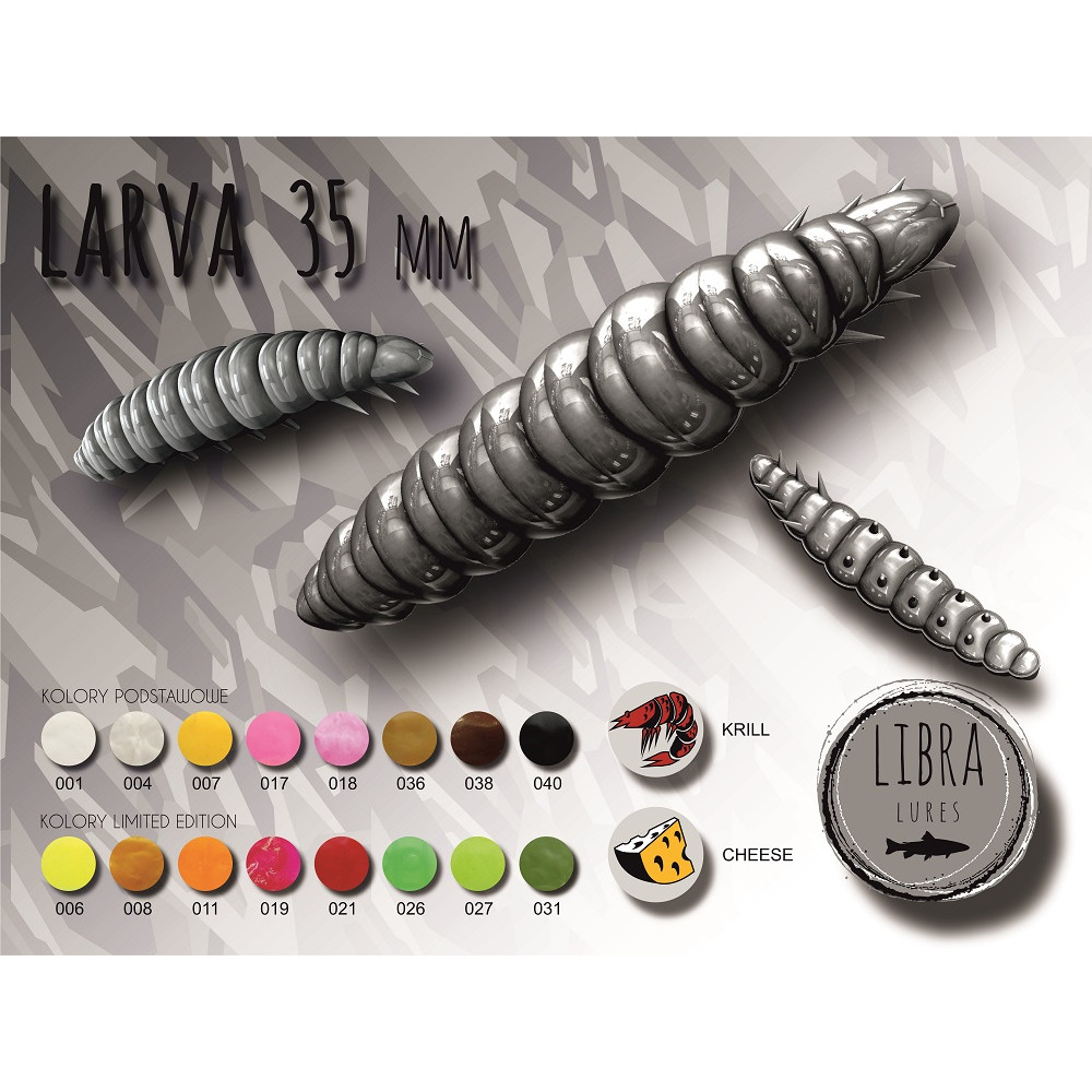 LARVA е водещият модел на компанията Libra Lures. Ларвите са най-често консумирана храна от пъстърва, кефал, дори и бяла риба, основна независимо от сезона. Стотици часове тестване, анализ и метаморфоза на този модел направиха имитацията на нашите ларви, подходящата му геометрия и използването на уникална смес я правят почти перфектна примамка, което я прави подходящ както за течащи, така и застояли води. Ларвата със сигурност ще бъде конкурентен убиец и на състезания по риболов на пъстърва, дъгова пъстърва и други подобни риби. Насекомото хризалис е основната храна на много видове риба. Уникалните свойства на материала означават, че дори и най-внимателната пъстърва няма да може да устои на страхотната и мека какавида. Добре обмислената форма на примамката я кара да реагира дори и при най-малкото движение на върха на пръта. Дава широк спектър от възможности на рибаря.