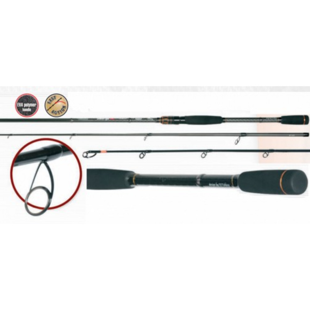 Изградена върху бланка от високомодулен IM8 карбон. Оборудвана с двуделна дръжка от EVA материал и KHL-SiC водачи. Fast Action.