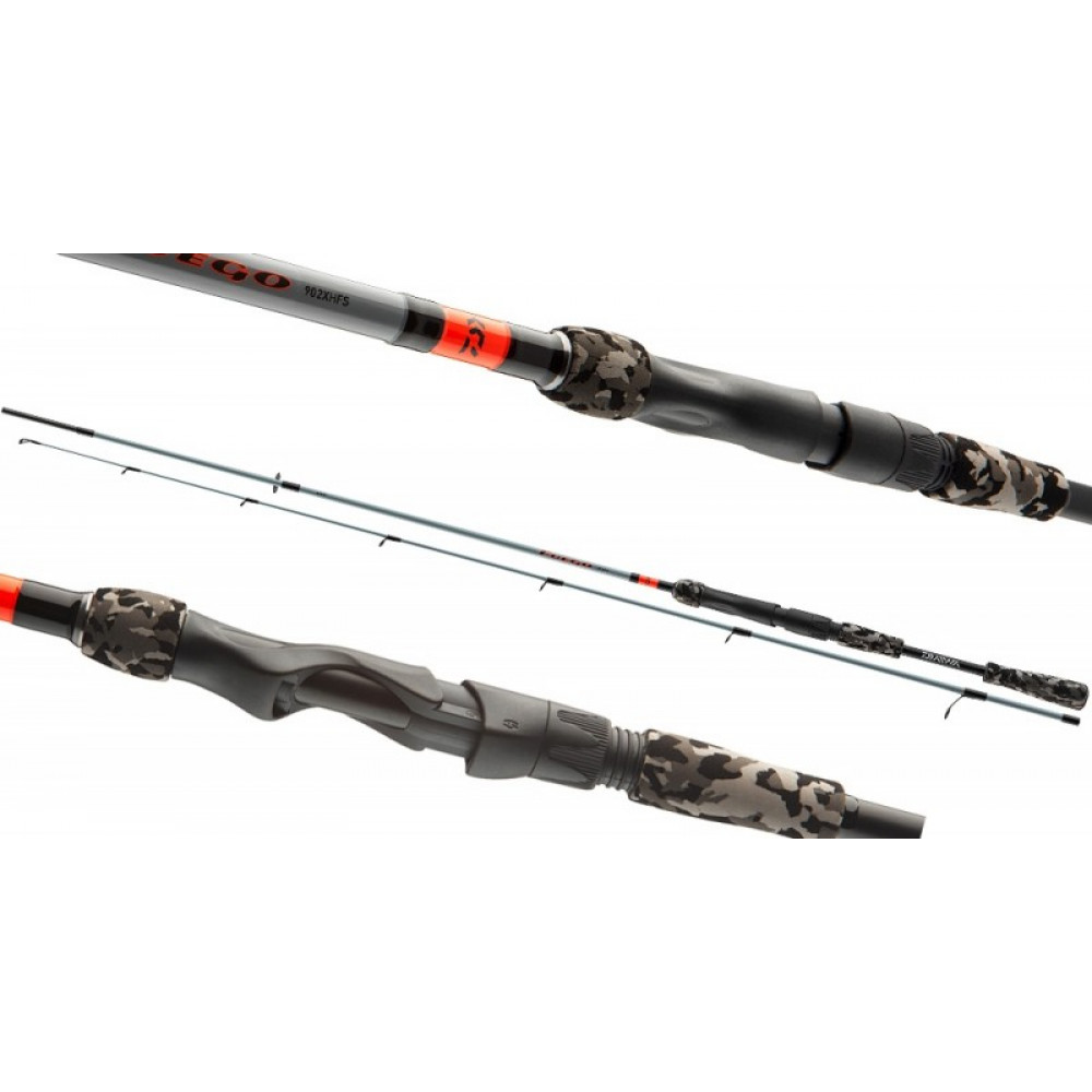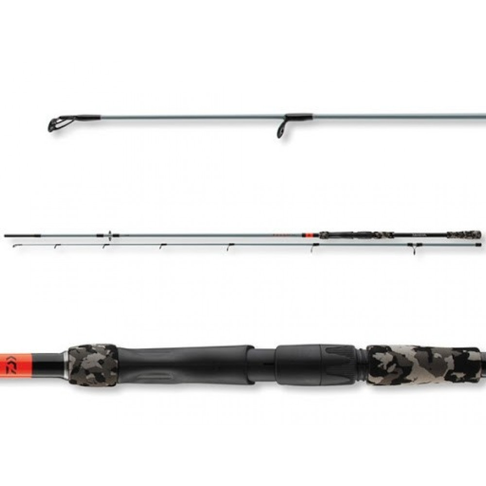 Със спининговите въдици Fuego Camo DAIWA предлага богата гама модерни въдици с много стегнати бланки, които – в зависимост от модела – покриват почти всички видове приложения при съвременния риболов на примамка. Благодарение на бързите бланки, въдиците Fuego Camo са особено подходящи за джигинг с меки пластмасови примамки. Използването на ексклузивния материал от въглеродни влакна HVF на DAIWA за дизайна на заготовката позволява разработването на много бързи и леки спининг въдици, които осигуряват приятно боравене и са много издръжливи. Тези въдици се отличават с модерен външен вид благодарение на сив цвят и са оборудвани с оригинален макародържач Seaguide и първокласна камуфлажна EVA дръжка. Макародържачът от концепцията Seaguide Alien позволява незабавен контакт с бланката благодарение на страничните джобове, които оптимизират представянето на примамката и откриването на ухапване. Ергономичната форма на макародържача допълнително гарантира удобно боравене и позволява постоянно забавление при риболов. Оборудван с леки водачи от титанов оксид.