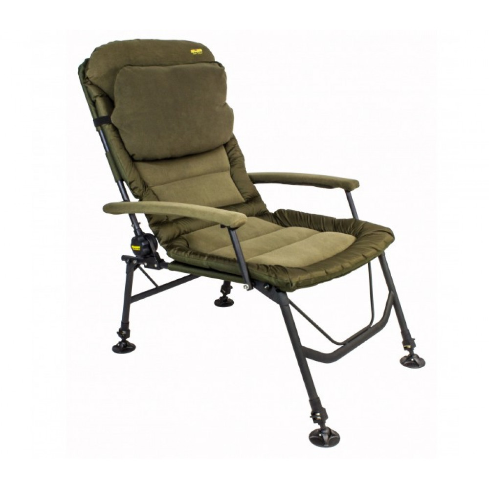 Разполага с алуминиеви подлакътници, с подвижна възглавница за висок комфорт, и най-важното - ъгълът на облегалката се нагласява спрямо нуждите на риболовеца. Разполага с големи пети, които предотвратяват потъването в кал. Благодарение на индивидуално регулируемите крака е изключително стабилен на земята.