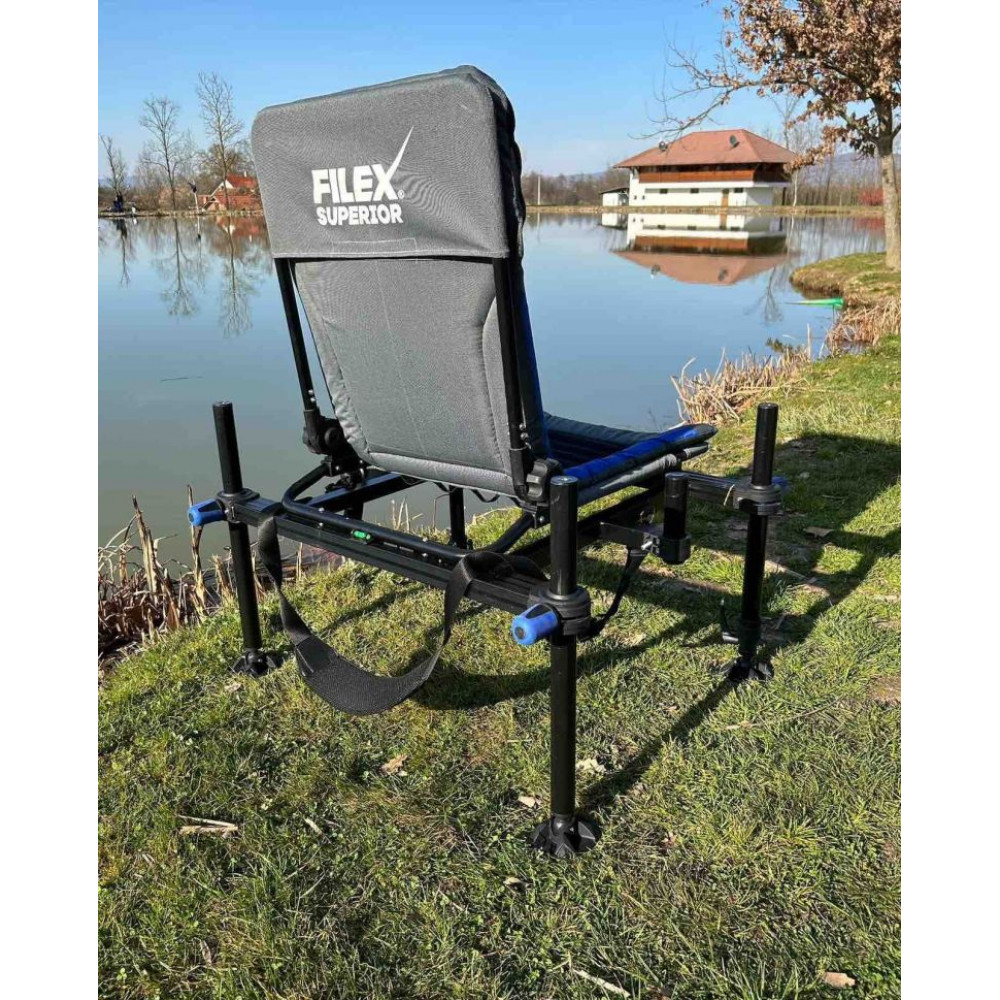 Fil Fishing Superior Feeder Chair е изключително стабилен и издръжлив стол за риболов на фидер, който осигурява максимален комфорт по време на риболов. Столът разполага с крака с диаметър от 36 мм, които гарантират допълнителна стабилност. Всички крака са оборудвани с универсална резба в горната си част, като предните 2 са регулируеми, а задните статични. Седалката и облегалката са изработени от мемори пяна. В средата на рамката са поставени две греди за монтиране на допълнителни аксесоари. Облегалката е регулируема. Разполага с удобна подплатена презрамка за улеснение при пренасяне.