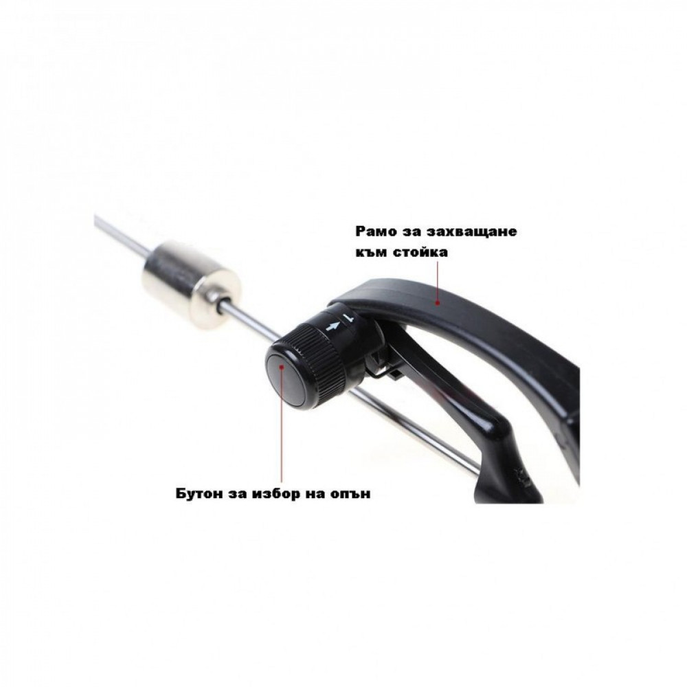 Сигурен заключващ механизъм за фиксиране на влакното със специално профилирана ключалка, която не може да нарани влакното по никакъв начин и ще се отключи чак когато вдигнете въдицата от стойката. Тристепенна система за обтягане на линията чрез пружинен механизъм като максимумът на опън е 170 грама. Допълнителната тежест за натягане е 70 грама. В предната част на обтегача има възможност за поставяне на светеща ампула или беталайт, за постоянно светене. Обтегачите са светещи и с жак 2.5 мм за свързване към звуков сигнализатор.