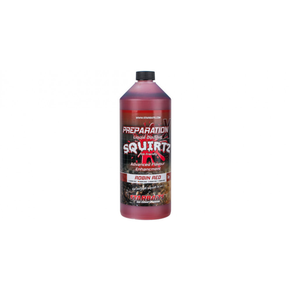 Течна добавка Starbaits Squirtz Preparation X Robin Red. Тази течна добавка представлява селекция от качествени 100 % натурални съставки и вкусове, подсилващи аромата и увеличаващи значително вниманието, което обръщат рибите на захранения периметър. Не разтваря PVA, което я прави отлична за директно използване върху монтажи с PVA .