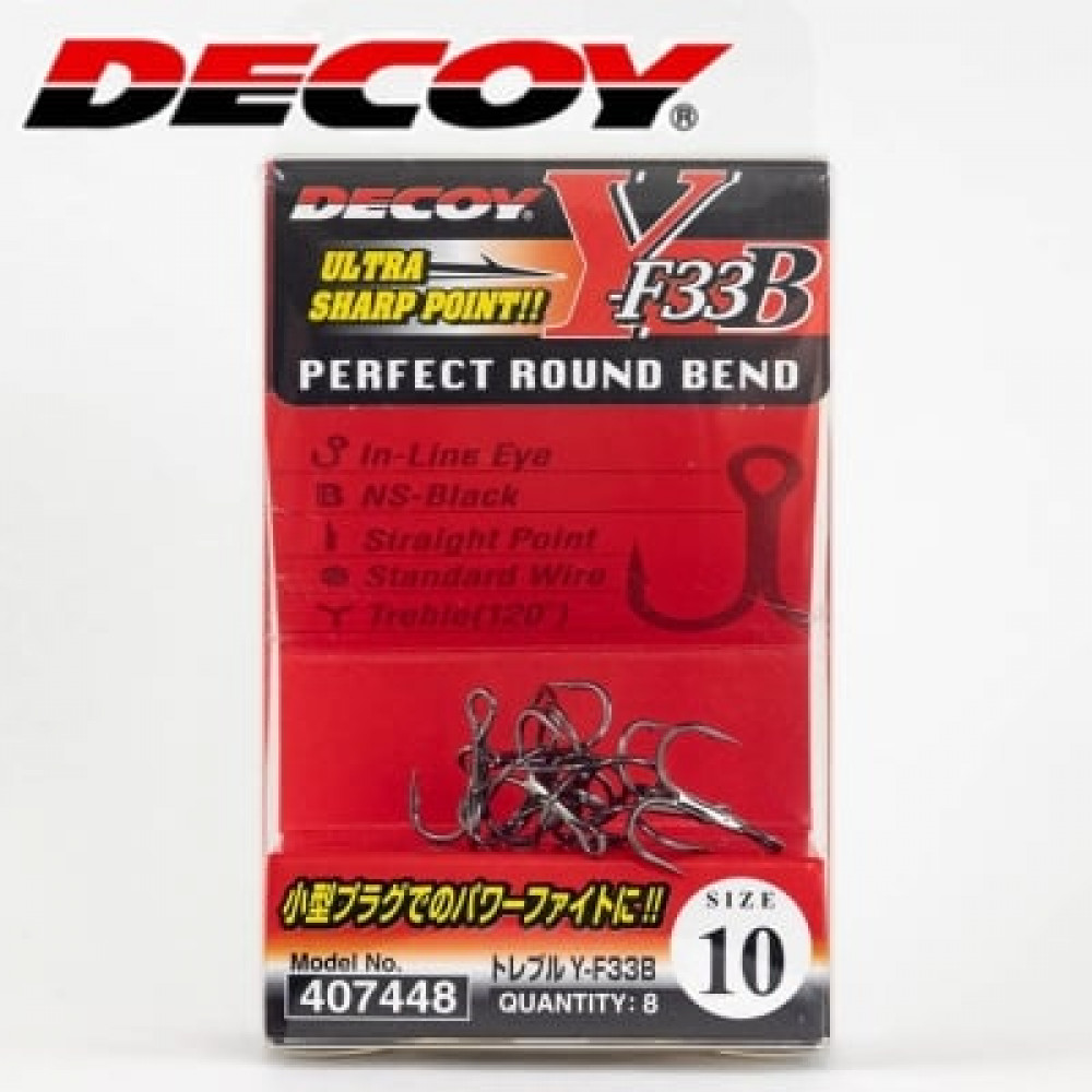 Decoy Y-F33B е кована, изключително здрава тройна кука. Формата е Т–образна, което я прави по-ефективна. Предимството на куките Decoy е, че при малка дебелина се постига по-голяма здравина. Перфектна като резервна кука на вашите изкуствени примамки.