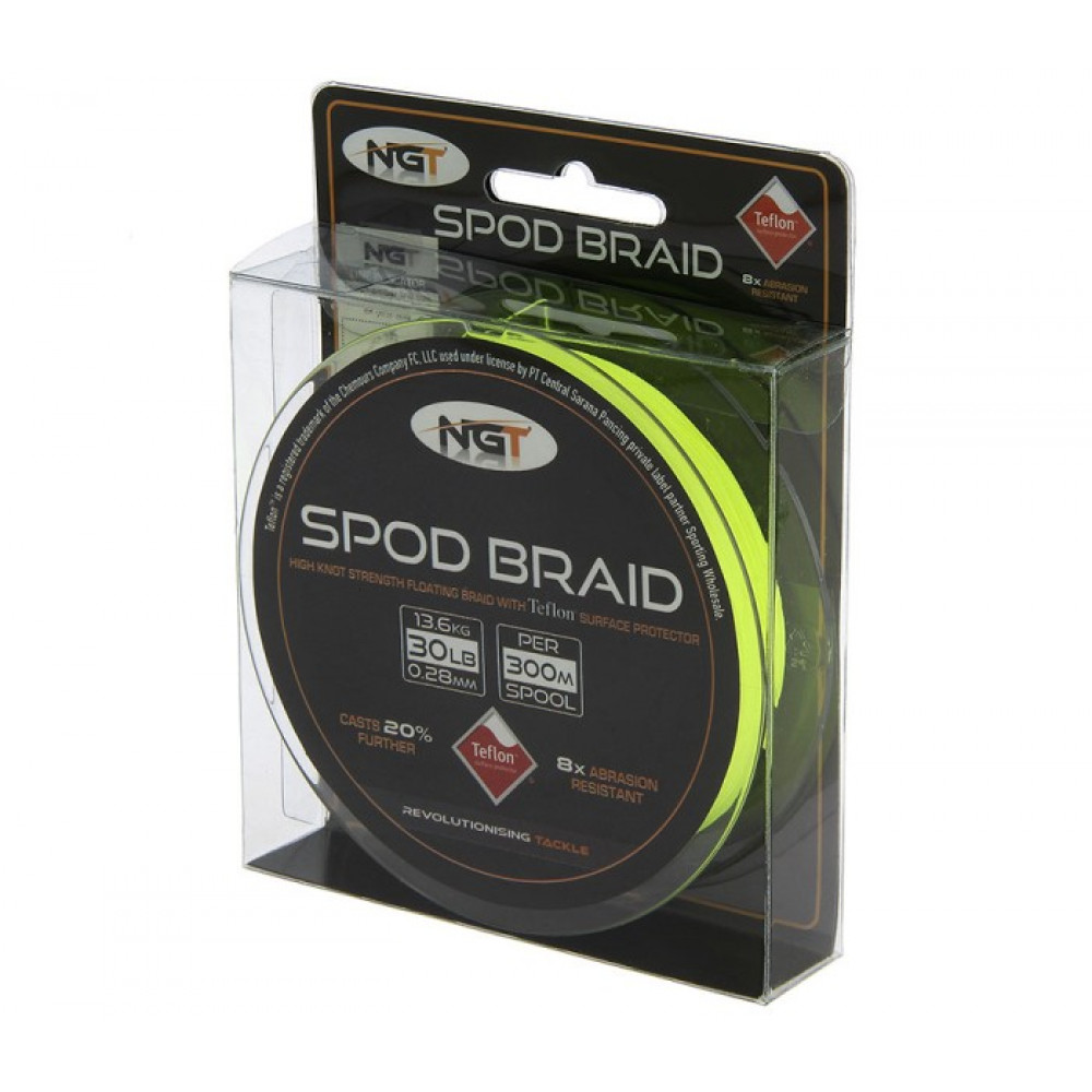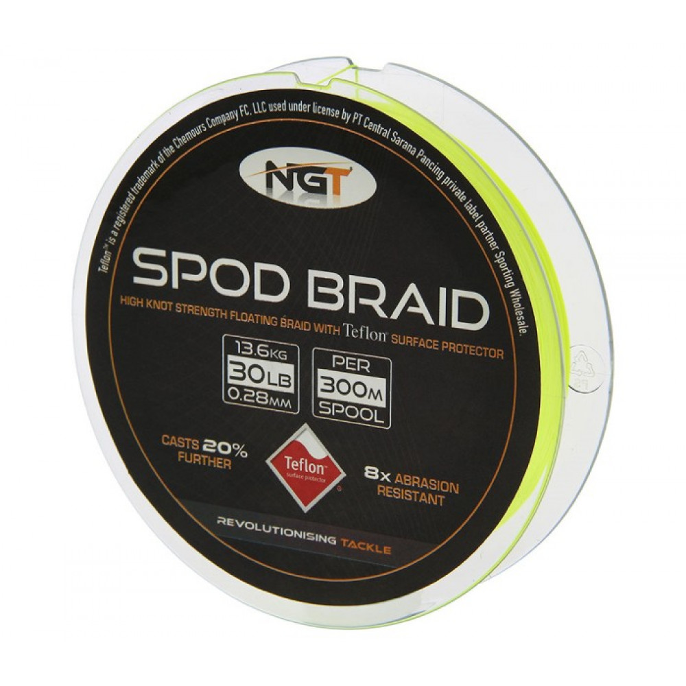 Влакно за спод NGT Spod Braid Fluoro Yellow Teflon Coated 300m е плетено влакно предназначено за СПОД/МАРКЕР, проектираноо е с тефлоново покритие и в същото време е изключително устойчиво на абразия и плуващо, за по-лесна видимост. Едновременно меко и изключително здраво с 20% повече от другите плетени влакна за спод на пазара.Влакно за спод NGT Spod Braid Fluoro Yellow Teflon Coated 300m е предназначено за ползване на спод и маркер въдици и макари.