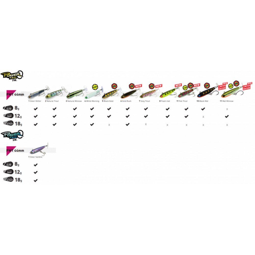 Fiiish Power Tai 44 мм е изключително успешна примамка за улов на пъсърва, кефал, костур и морски хищници. С различна разновидност от грамажи, Power Tail е много добре успешен в течащи и спокойни води, като за риболов на места с по-силно течение е препоръчително да се използват по-големите грамажи за даден размер. Оборудван е със стопер диск на опашката, който е изработен от прозрачен материал, като добавя повече движение и вибрация към примамката, дори когато тя пропада. Примамката може да се води в различни водни слоеве,равномерно или с паузи, като по време на пропадане също има игра.