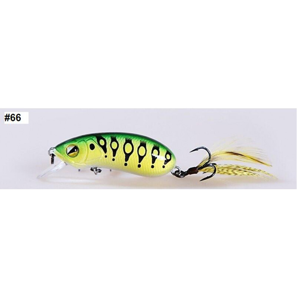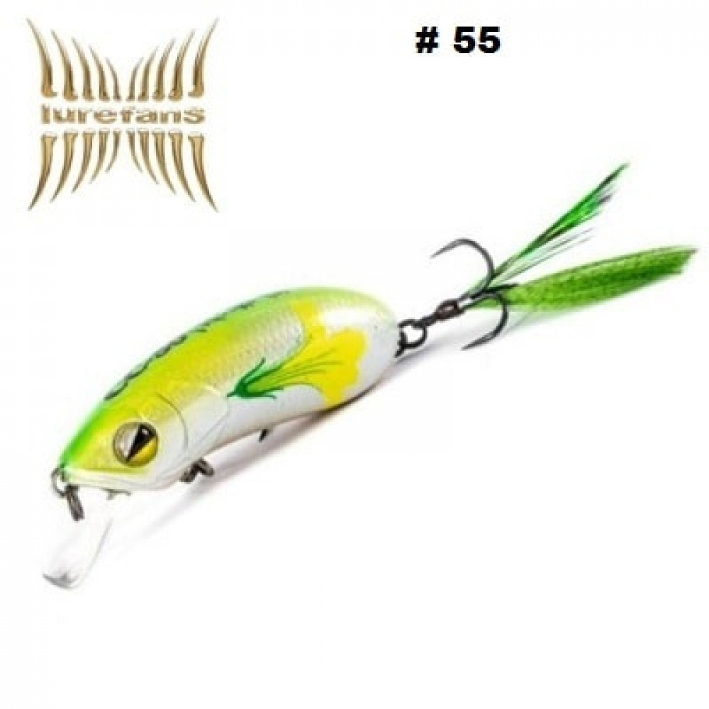 Lurefans - Cunning Cub, CC50 е специално създаден за капризни риби, хранещи се основно с насекоми. Високочестотната му вибрация и живите цветове провокират всяка риба. Изключително подходящ за кефали, пъстърви и костур.Задната тройка е оборудвана с перо в цвят подхождащ на окраската на воблера. Освен да придава визуален сигнал, перцето усилва и играта на примамката.