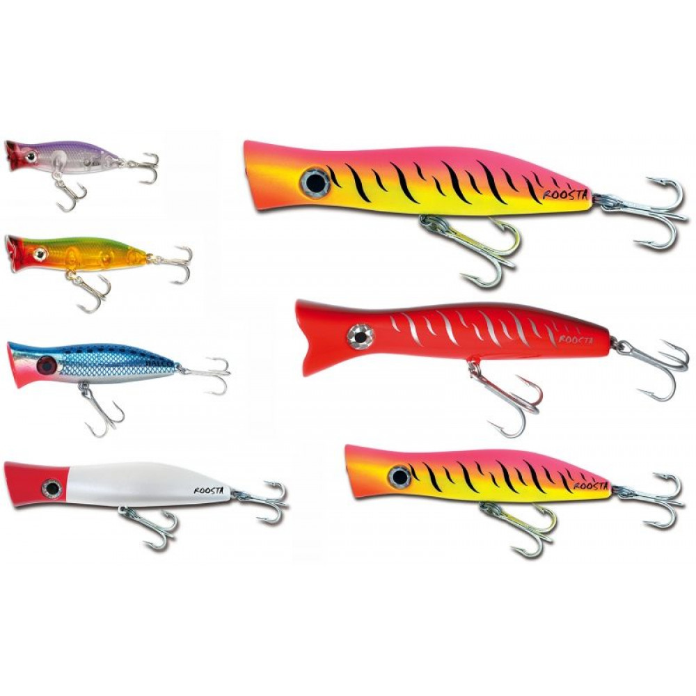Roosta Popper са воблери с нов модерен poper-дизайн, чиято иновационна разработка усъвършенства играта и стабилността им на повърхността. Формата на главата, която е широка на върха, преминава към удължено тяло до опашката. Този уникален дизайн прави popper идеален при отривисти придърпвания, като оставя следа от мехурчета и забавя издигането на воблера. Roosta Popper проблясва и трепти, а вибрациите примамват рибата и от най-дълбокото и прикритие. Конструкцията на воблера намалява усукването, а тракането осигурява специфичен шум, комбиниран с водни пръски.